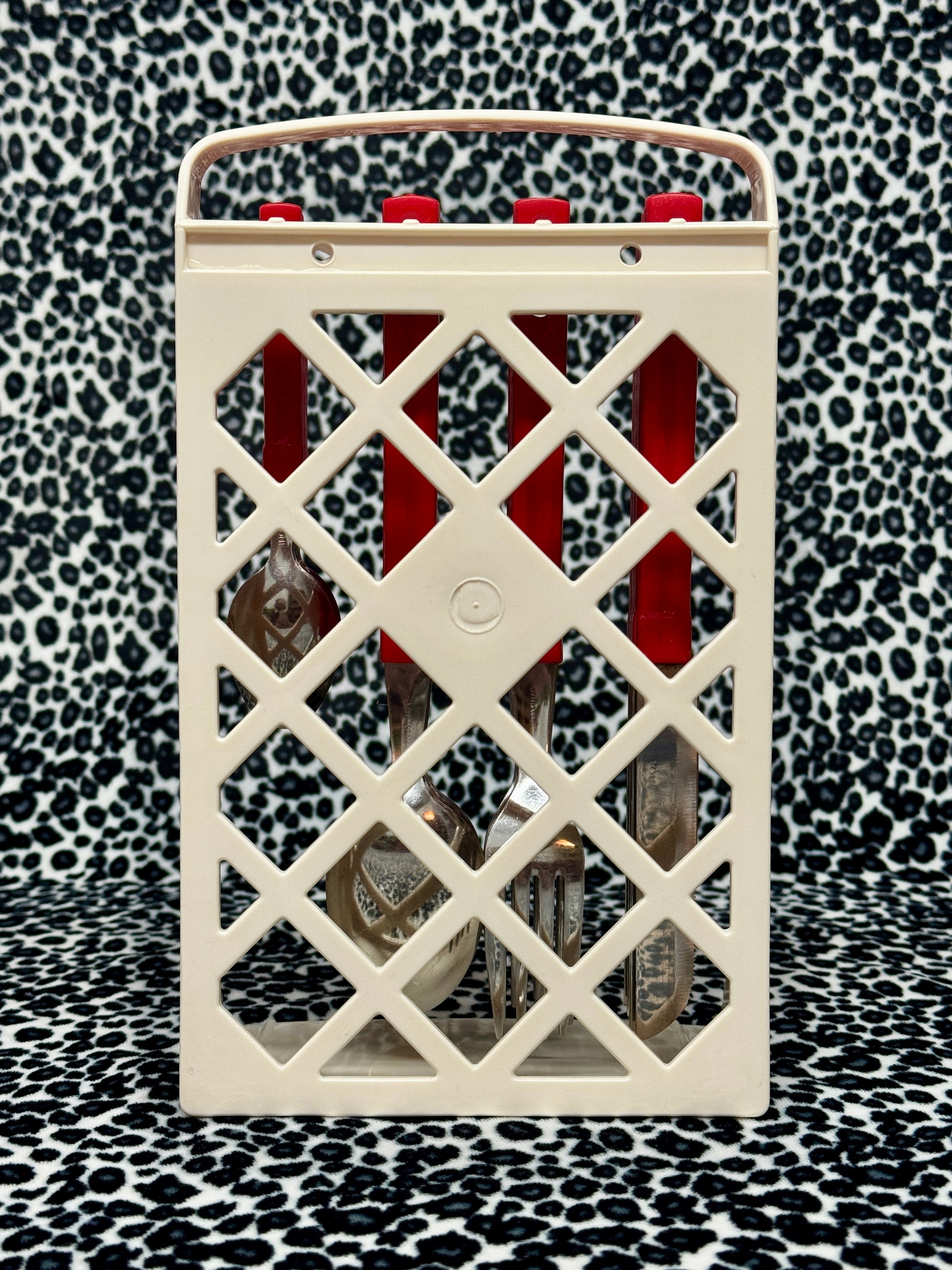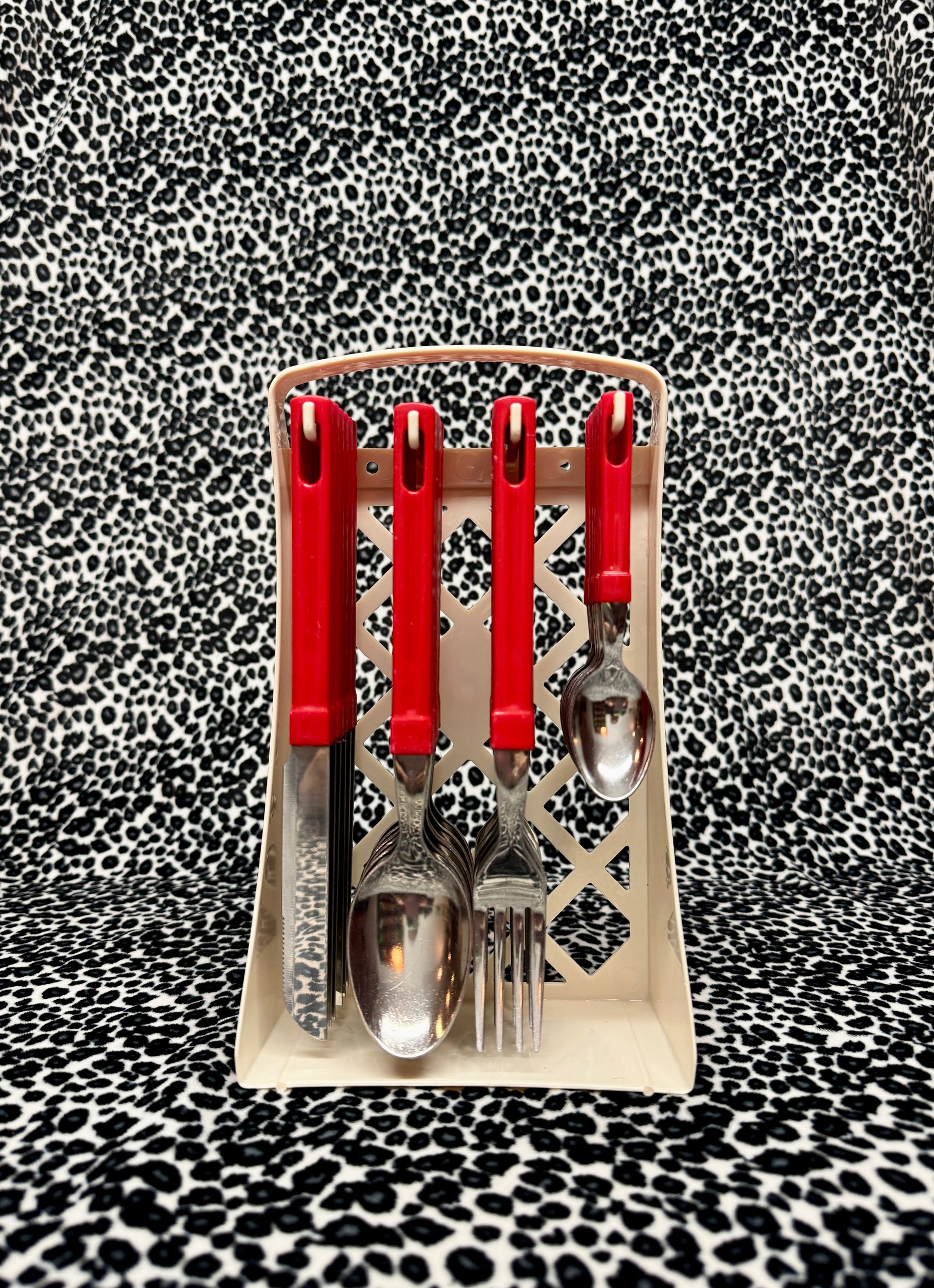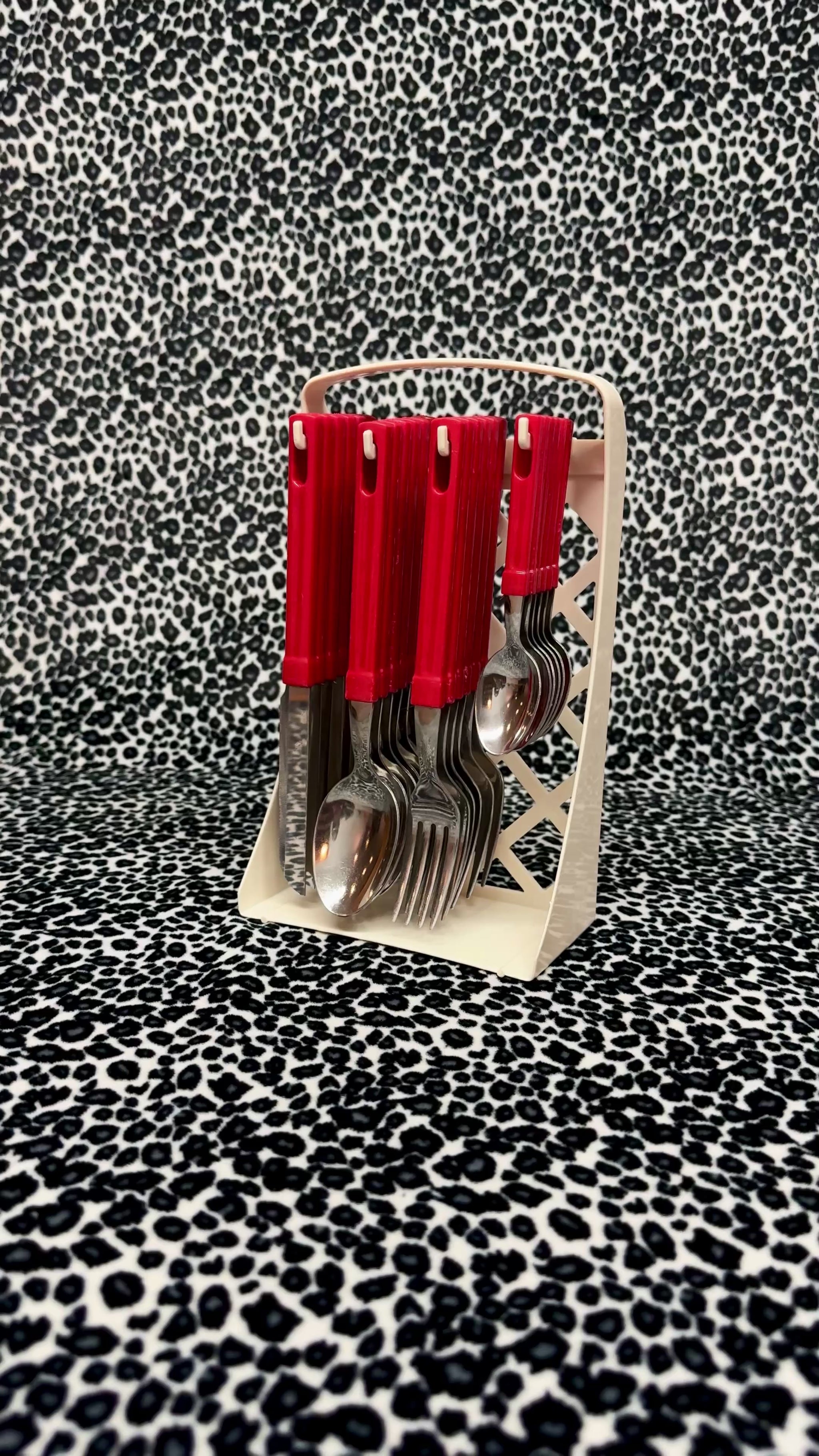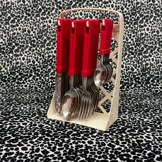 80s Vintage Red 24 piece stainless steel cutlery set with stand