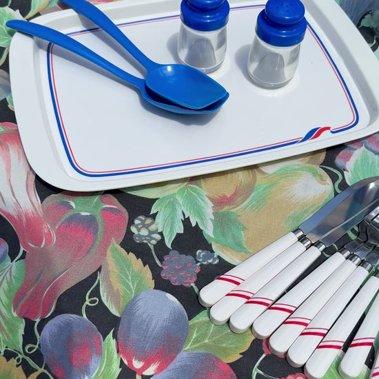 - Cutlery set with white handles and red stripe detailing (knives, forks & spoons)