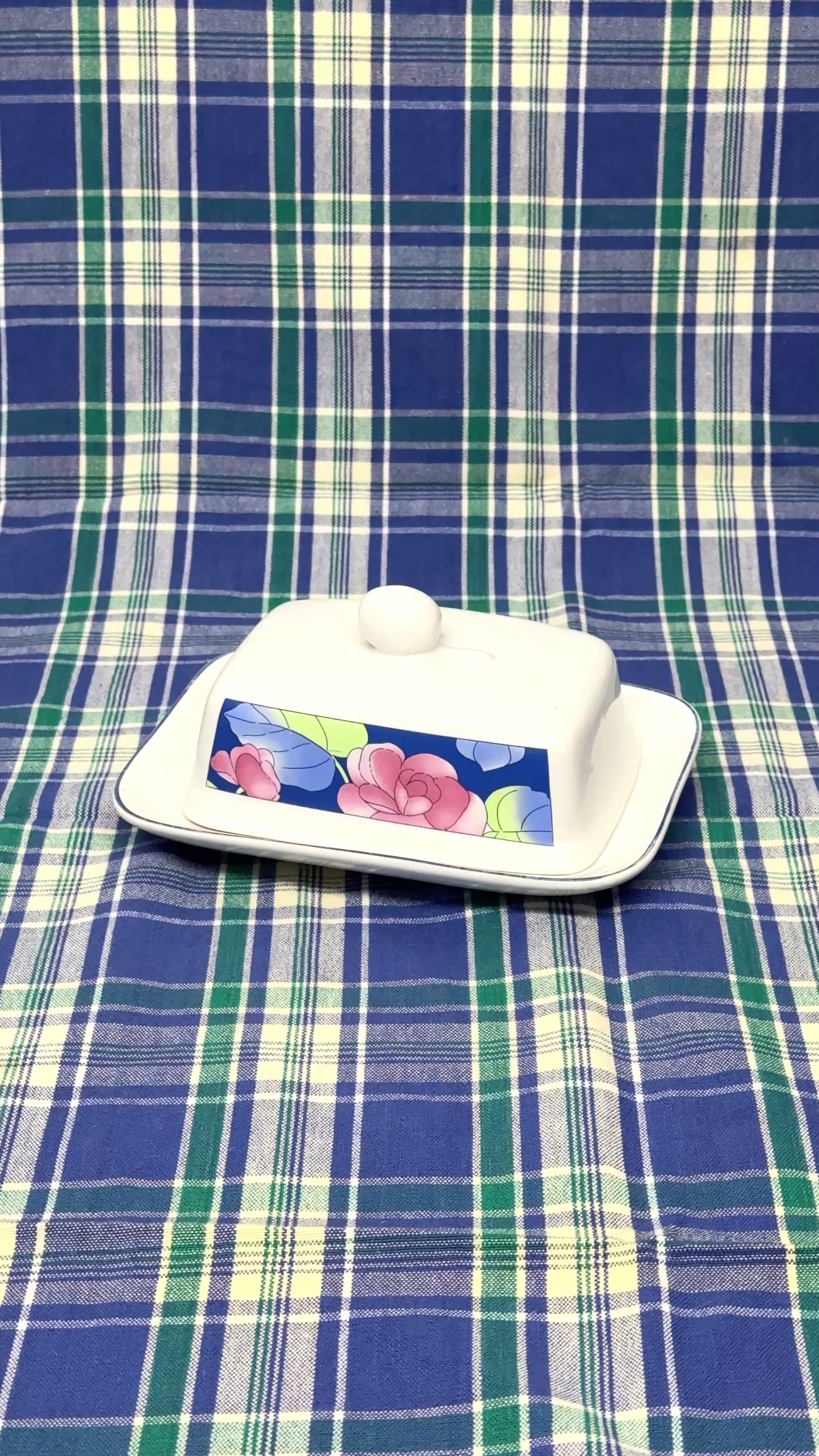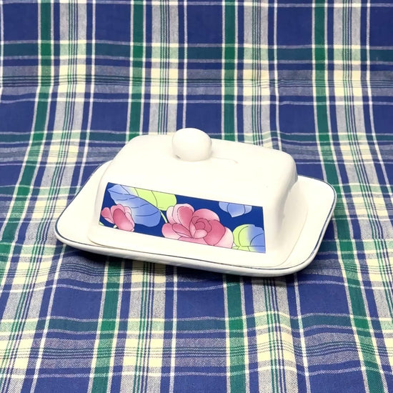 Vintage rare ceramic butter dish by International Tableworks (INT’L China Co.), made in Taiwan in the 1980s. Decorated with a vibrant floral panel in pink, blue and green, this cheerful piece is both functional and collectible.