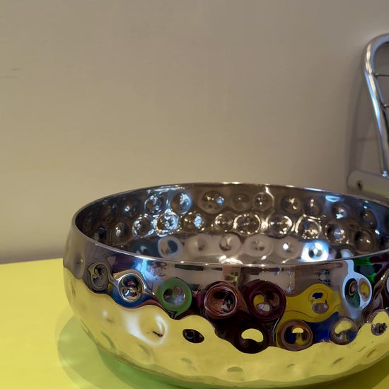 A 12-inch Bolt Hammered Salad Bowl brings a creative, fun style to the table. The art of metal forging not only improves the aesthetics of tableware but also its longevity. Hot forged bowls are particularly hard and often more cost effective than alternatives. The bolt hammering process compresses the metal, which is non-porous and thus resistant to stains.