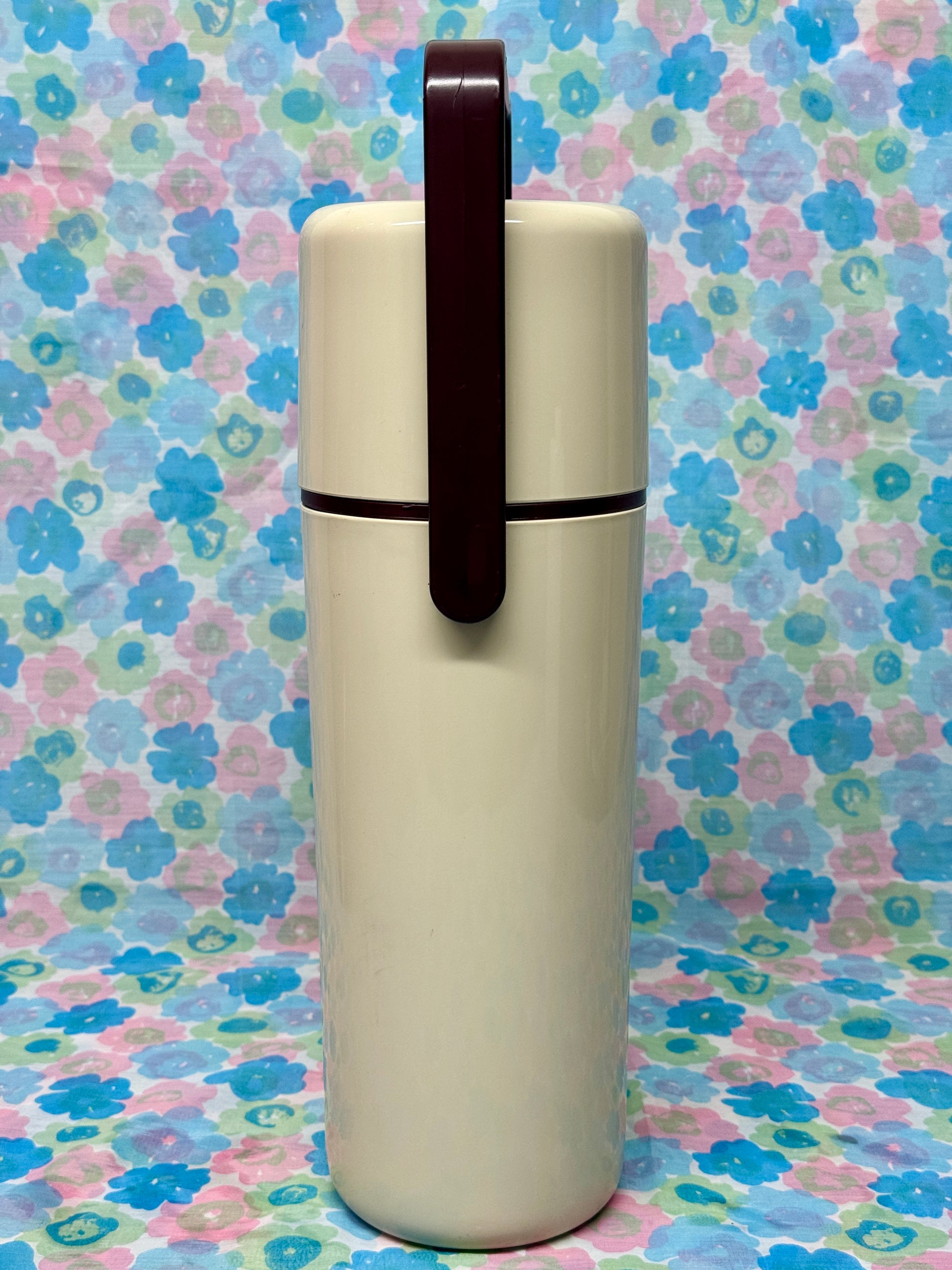 Designed by Richard Carlson, this stylish 1970s insulated wine cooler is a sleek and functional piece of mid-century design. Made in cream-toned plastic with a contrasting dark brown swing handle, it includes two original internal canisters with screw-top lids—ideal for chilling and transporting wine or other beverages. A minimalist, utilitarian classic, perfect for display or use.