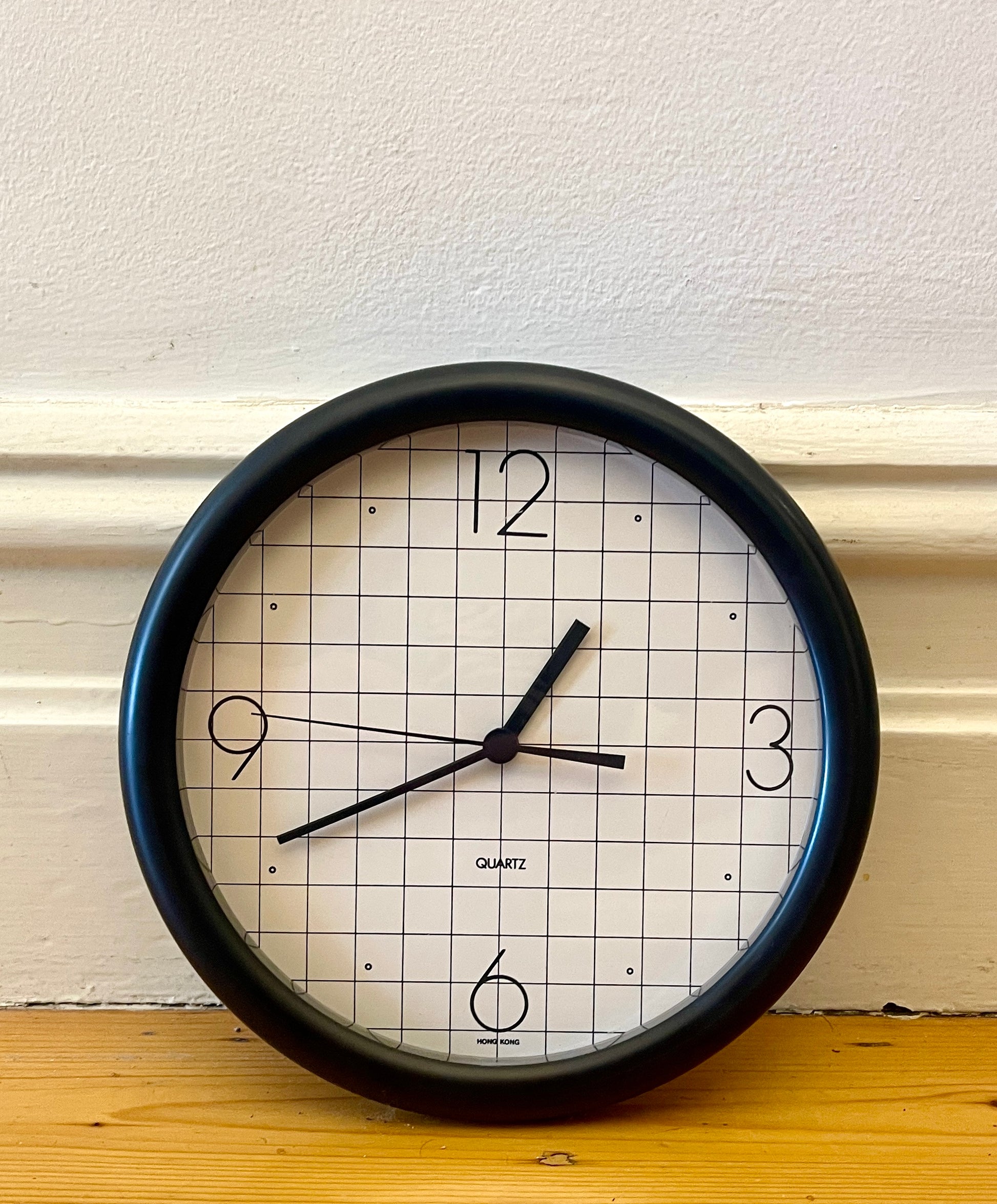 This vintage wall clock is a graphic standout with a black frame, clean grid face, and oversized numerals give Bauhaus-meets-postmodern vibes. Made in Hong Kong and powered by quartz movement, it’s a rare find from the late 1980s–90s, perfect for lovers of postmodern or schoolhouse-style design.