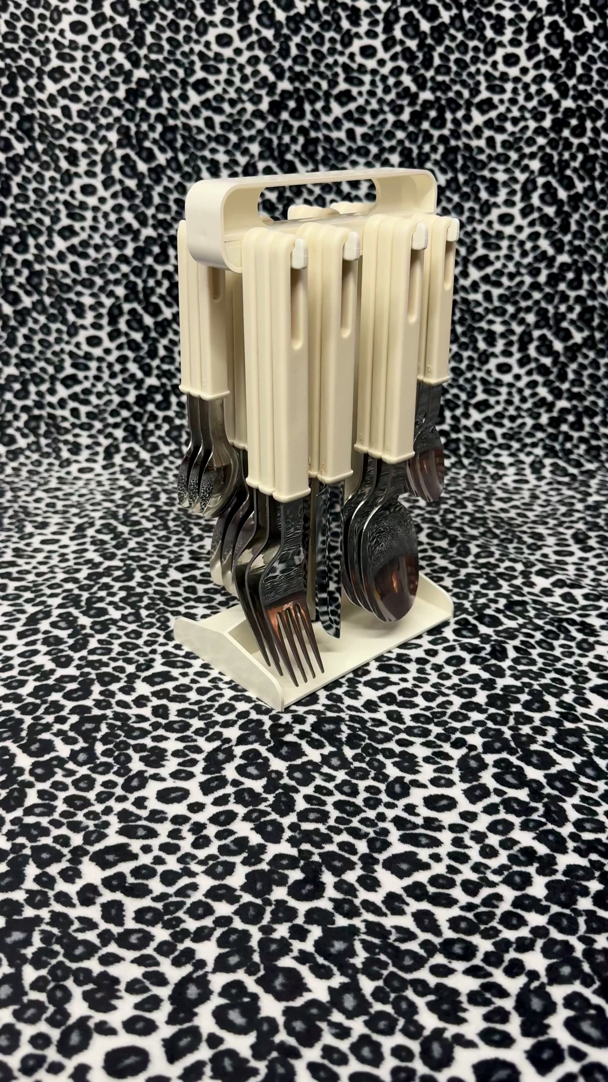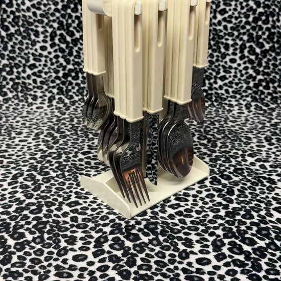 A rare retro find. This 24-piece vintage cutlery set features sleek cream handles and chrome-toned stainless steel heads, all displayed on a matching wall-mounted rack, a true example of 1970s Space Age design.