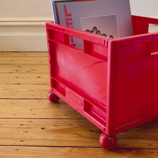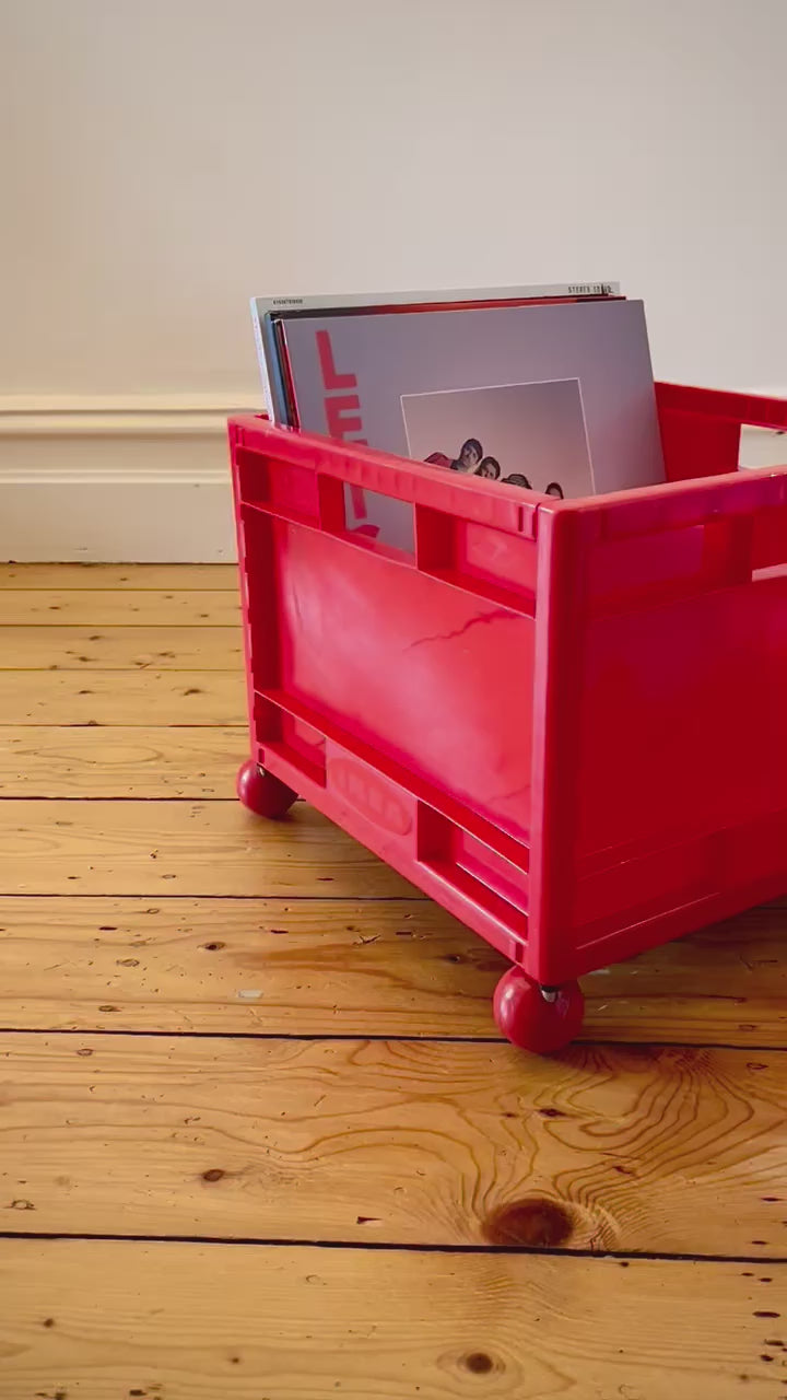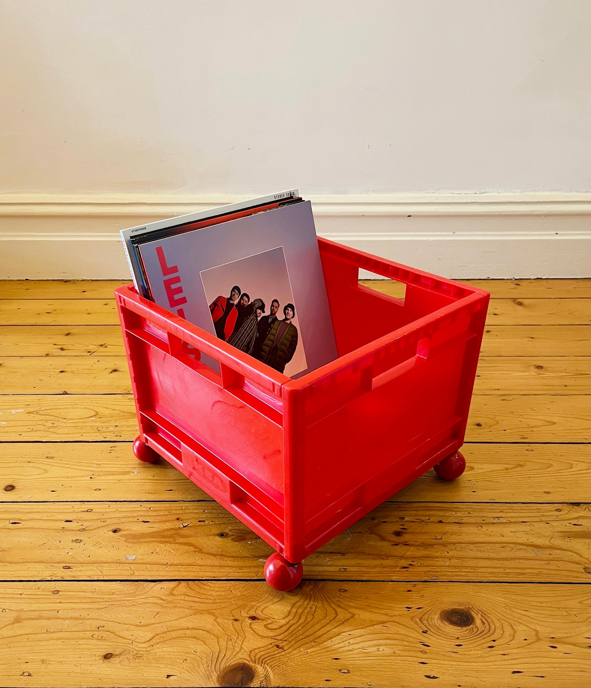 Add a pop of retro charm to your space with this rare Vintage IKEA Märd Red Rolling Crate – Rare 1990s Design crate in vibrant red. This cult classic features iconic ball wheels and side handles for easy movement. Perfect for storing vinyl records, books, toys, or magazines. In good vintage condition with minor signs of age. Hard to find – especially in this colour!