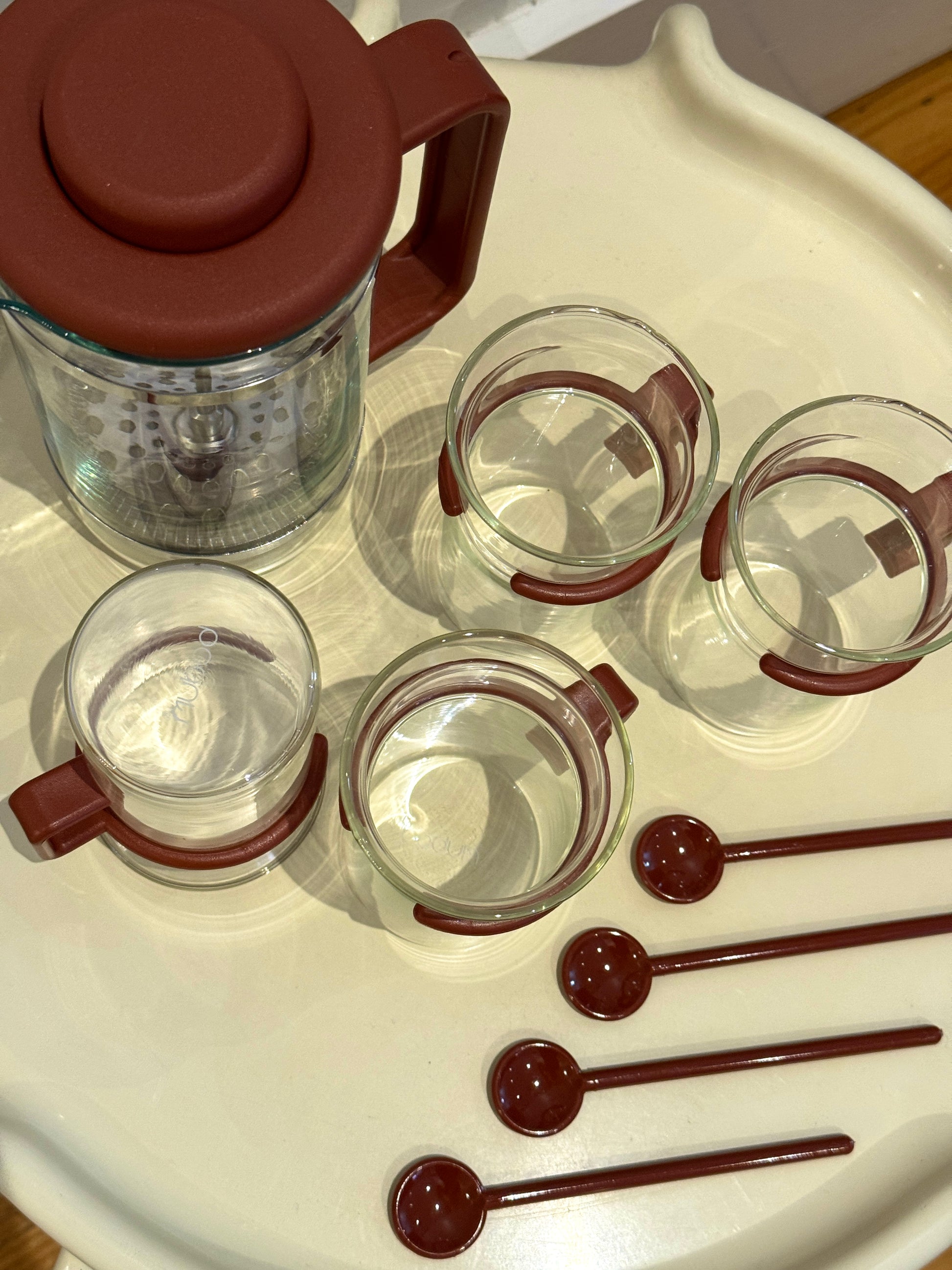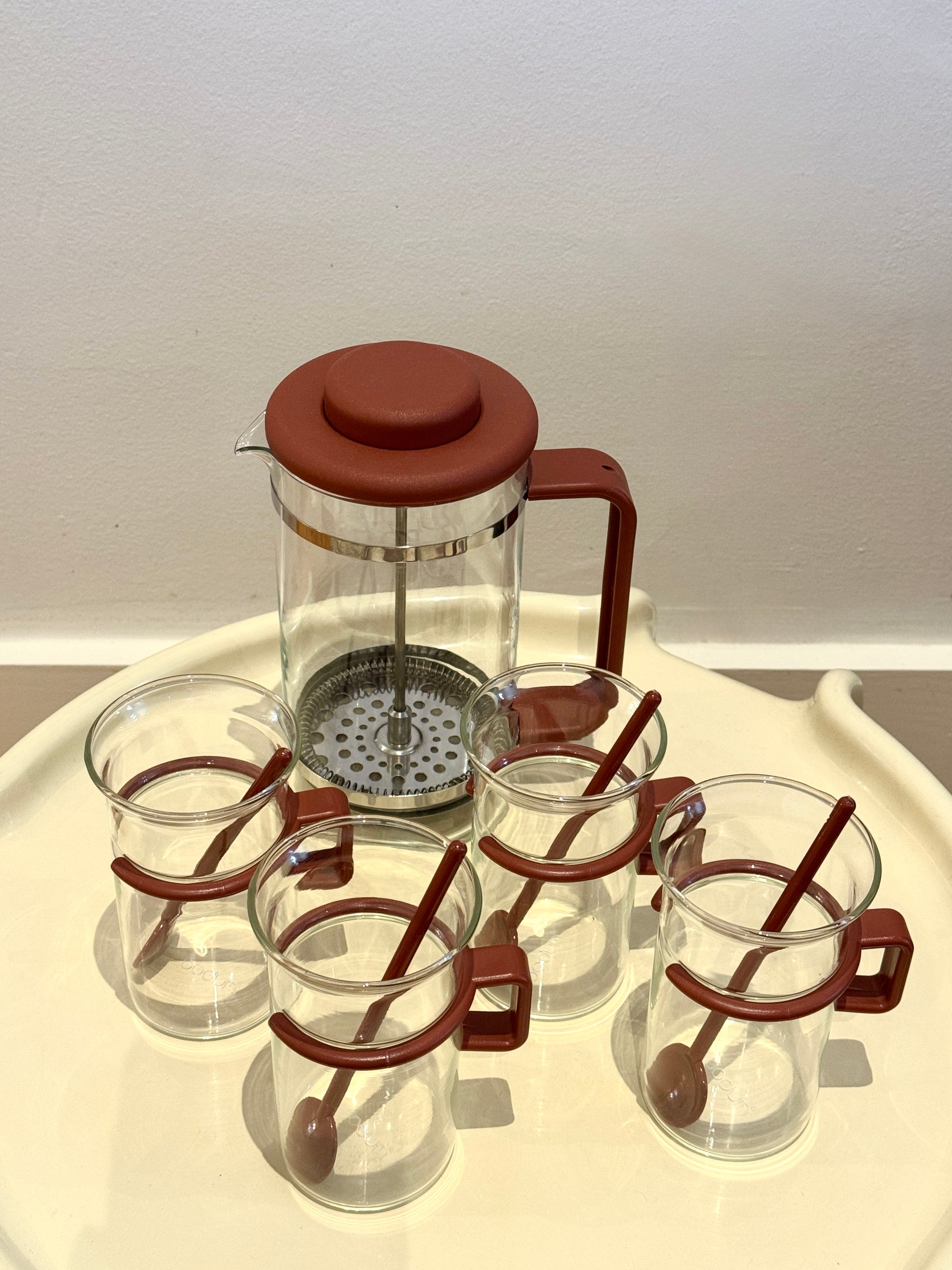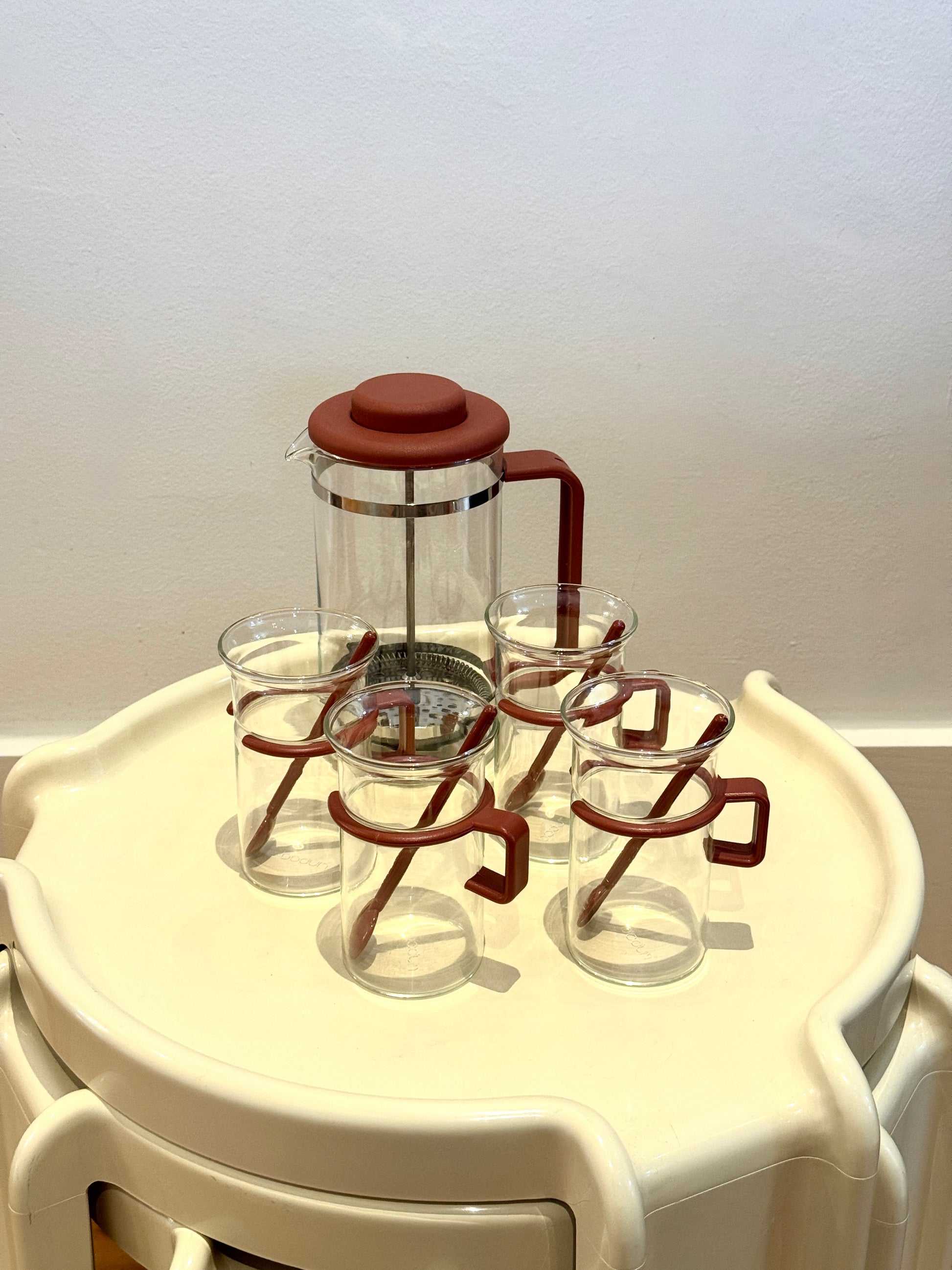 Stylish and rare vintage Bodum set in warm terracotta brown with clear glass and signature geometric handles. This set embodies the clean lines and functional elegance of late 20th-century postmodern design, perfect for collectors or design-forward coffee lovers.