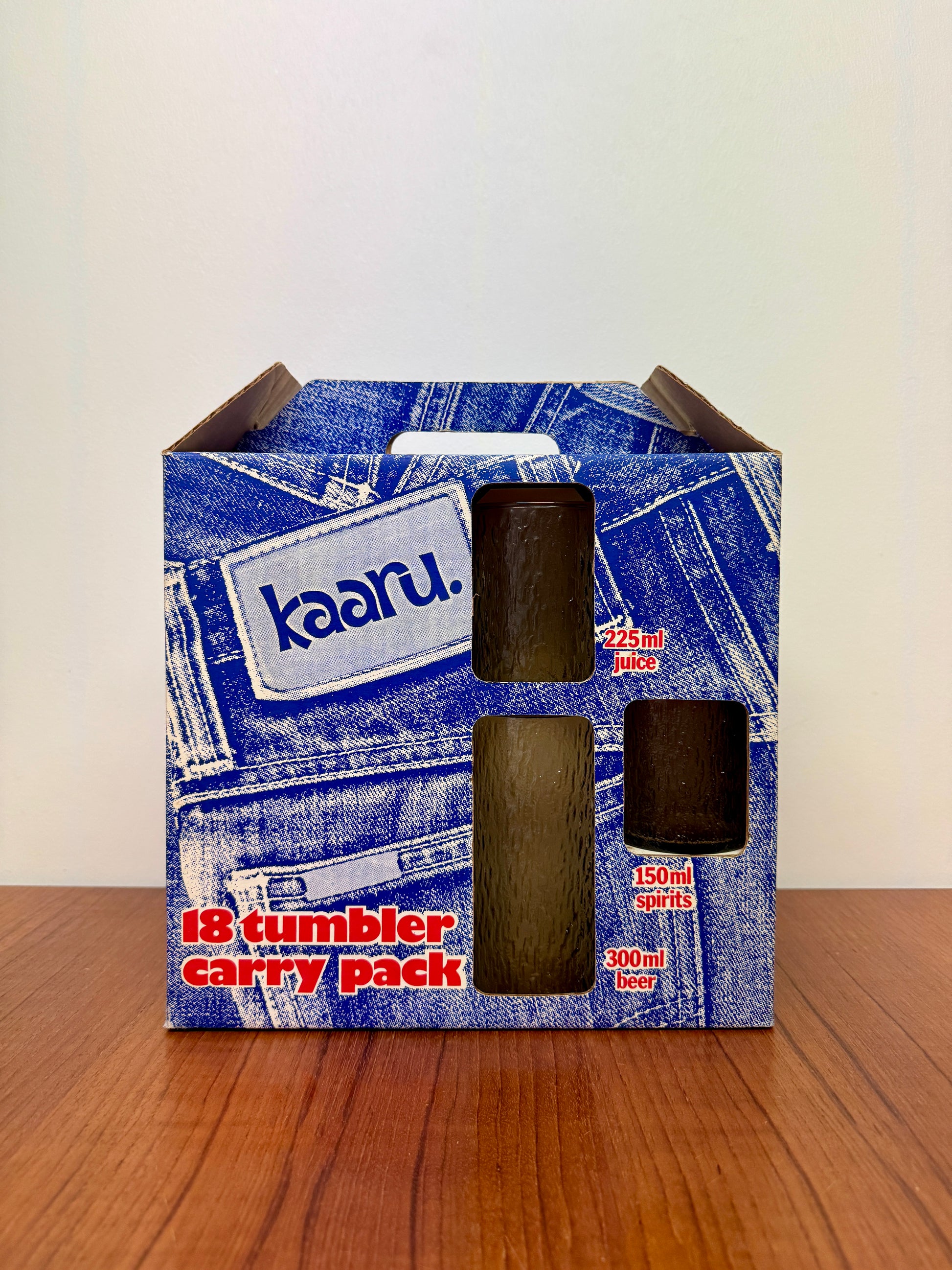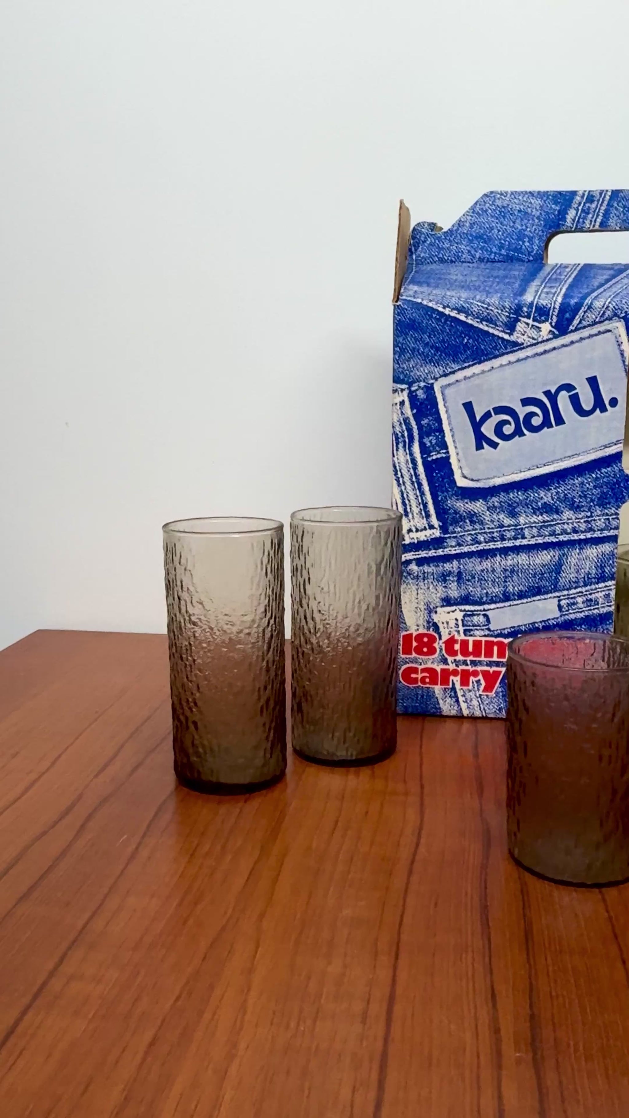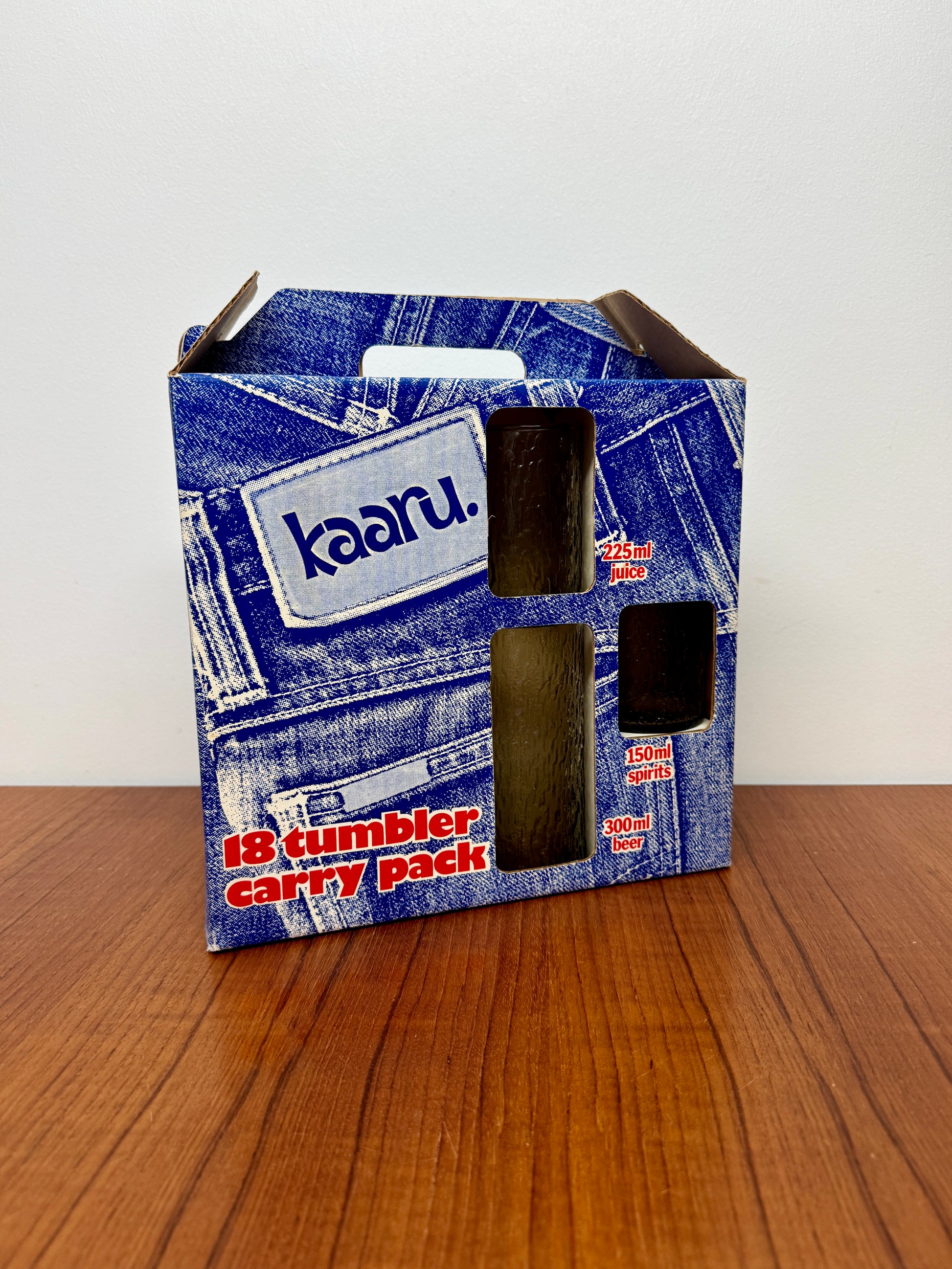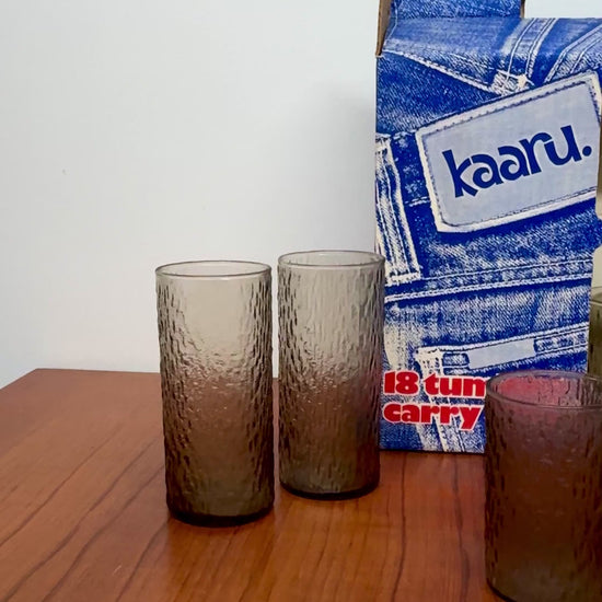 Vintage 1970s–80s Kaaru 18pc smokey textured glass tumbler carry pack | NZ-Made with Original Denim Box