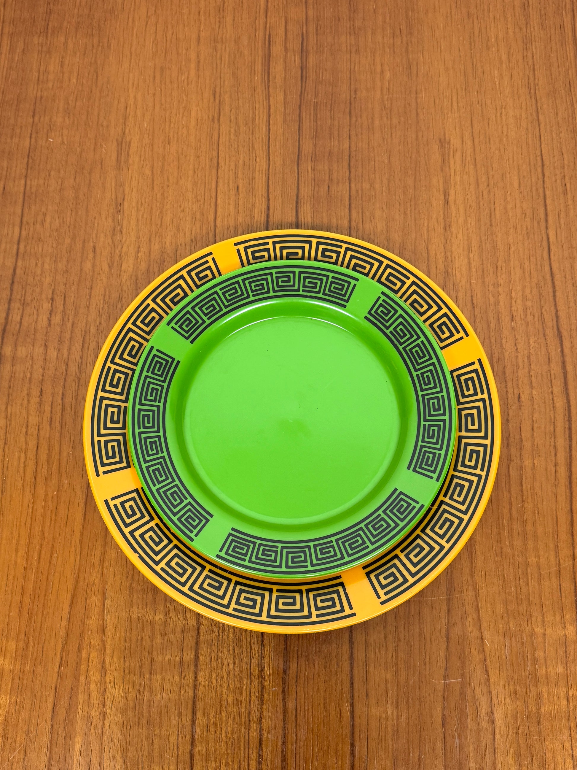 Vintage British Plastics Plate Set – 8pc Greek Key Design | Mustard & Green
