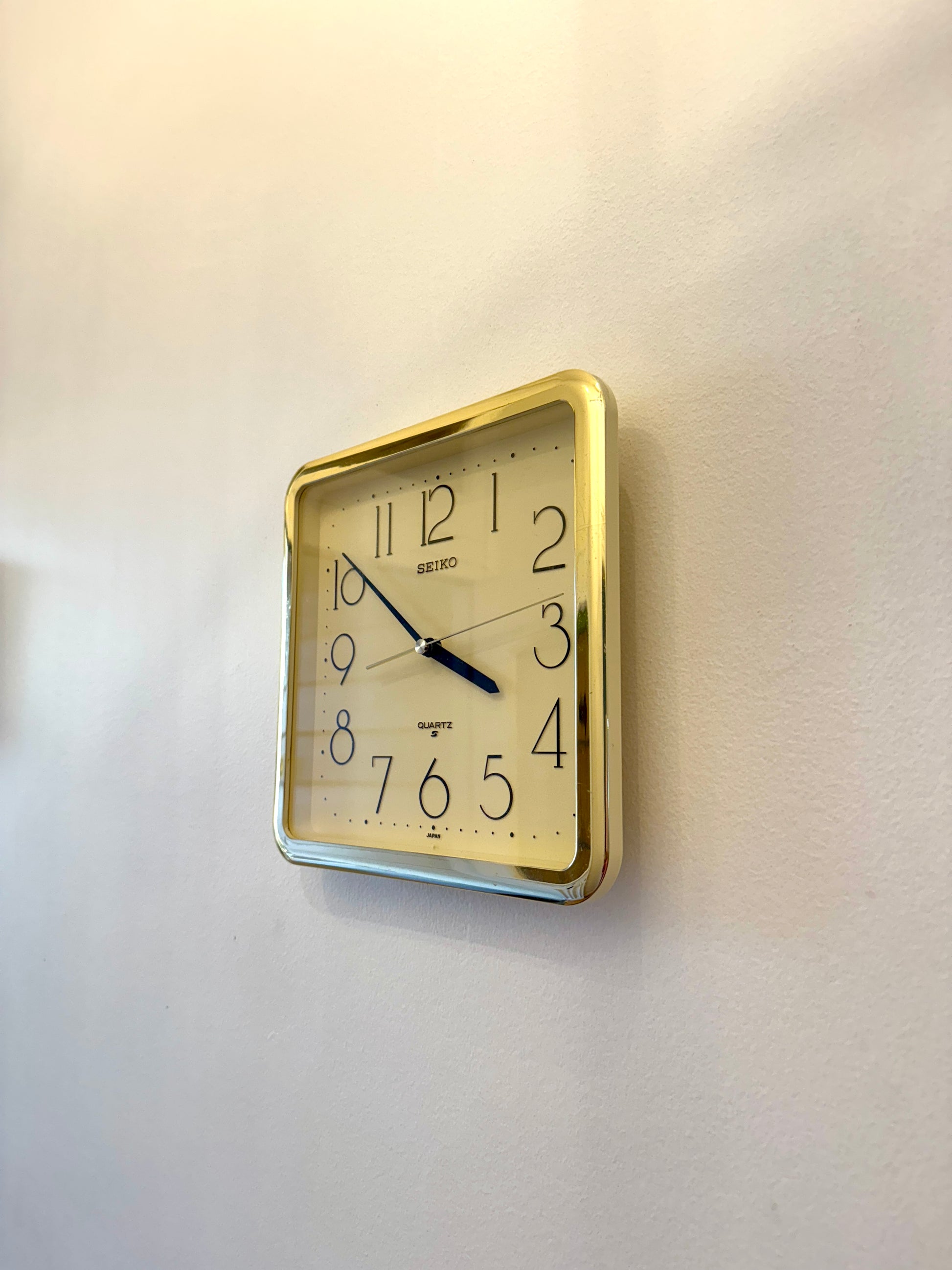 Timeless and elegant, this vintage Seiko wall clock features a sleek square shape with a polished gold-tone frame and minimalist black numerals. A beautiful example of Japanese quartz craftsmanship, it combines function and style with a quiet, reliable movement and clean mid-century inspired design.