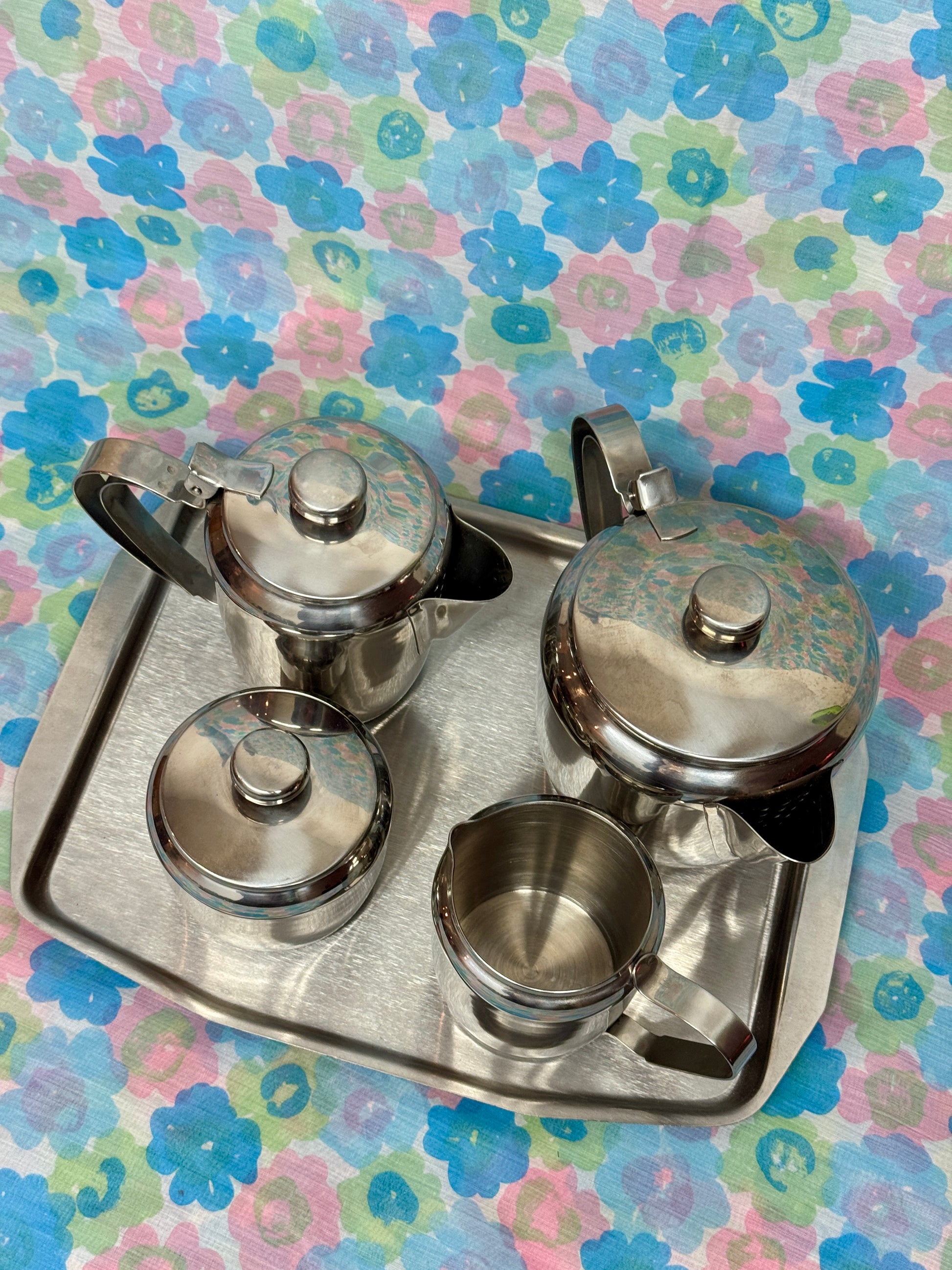 Crafted from quality 18-8 stainless steel, the set combines durability with a timeless aesthetic. Whether you’re a tea enthusiast or a vintage collector, this set is a conversation-starter that’s rarely seen in such impeccable condition!