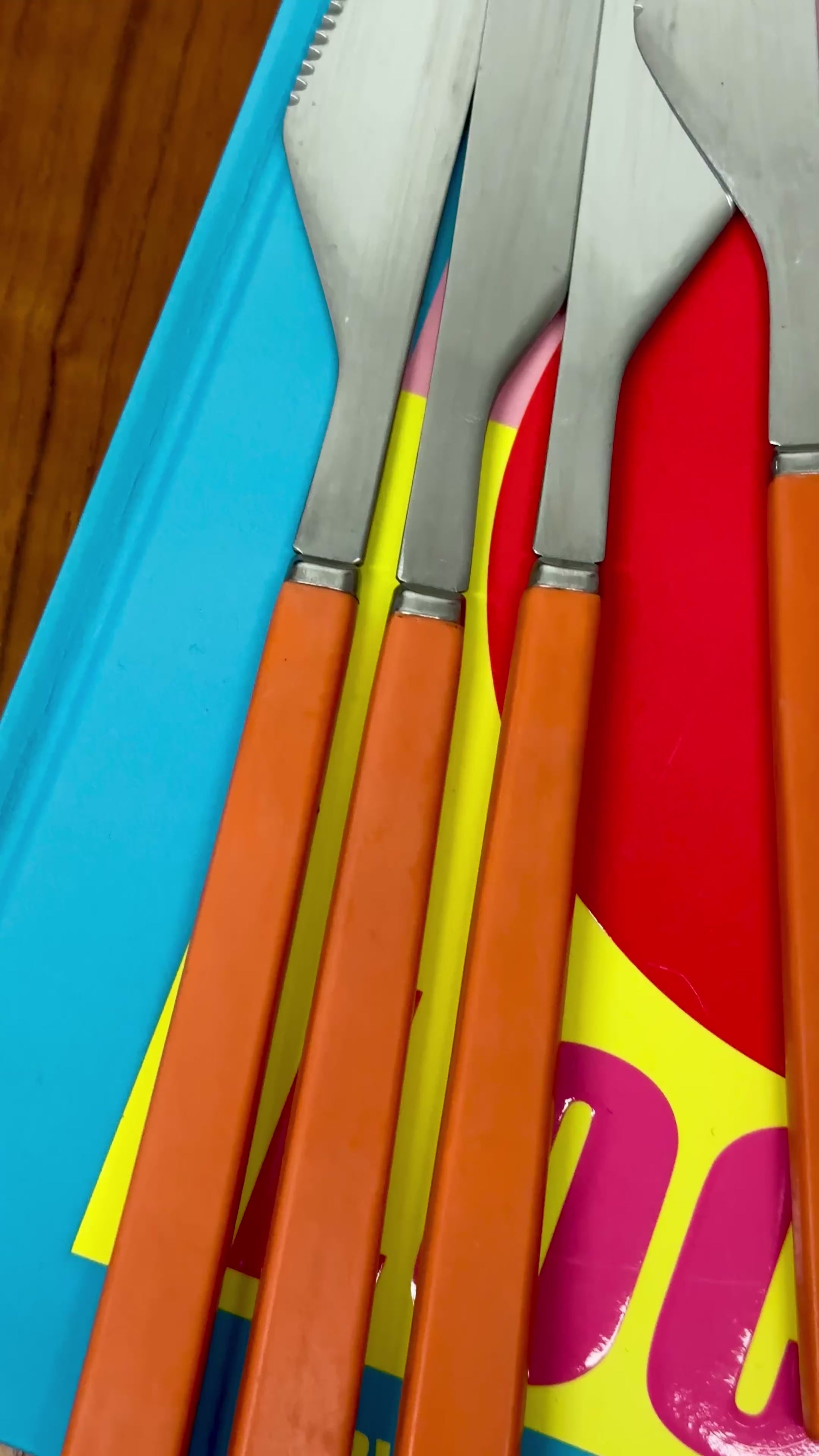 Vibrant 8-piece vintage cutlery set, featuring 4 serrated steak knives and 4 matching forks with bold orange handles. Mid-century charm meets everyday function – perfect for collectors or entertaining with flair. In good vintage condition with some signs of wear consistent with age.