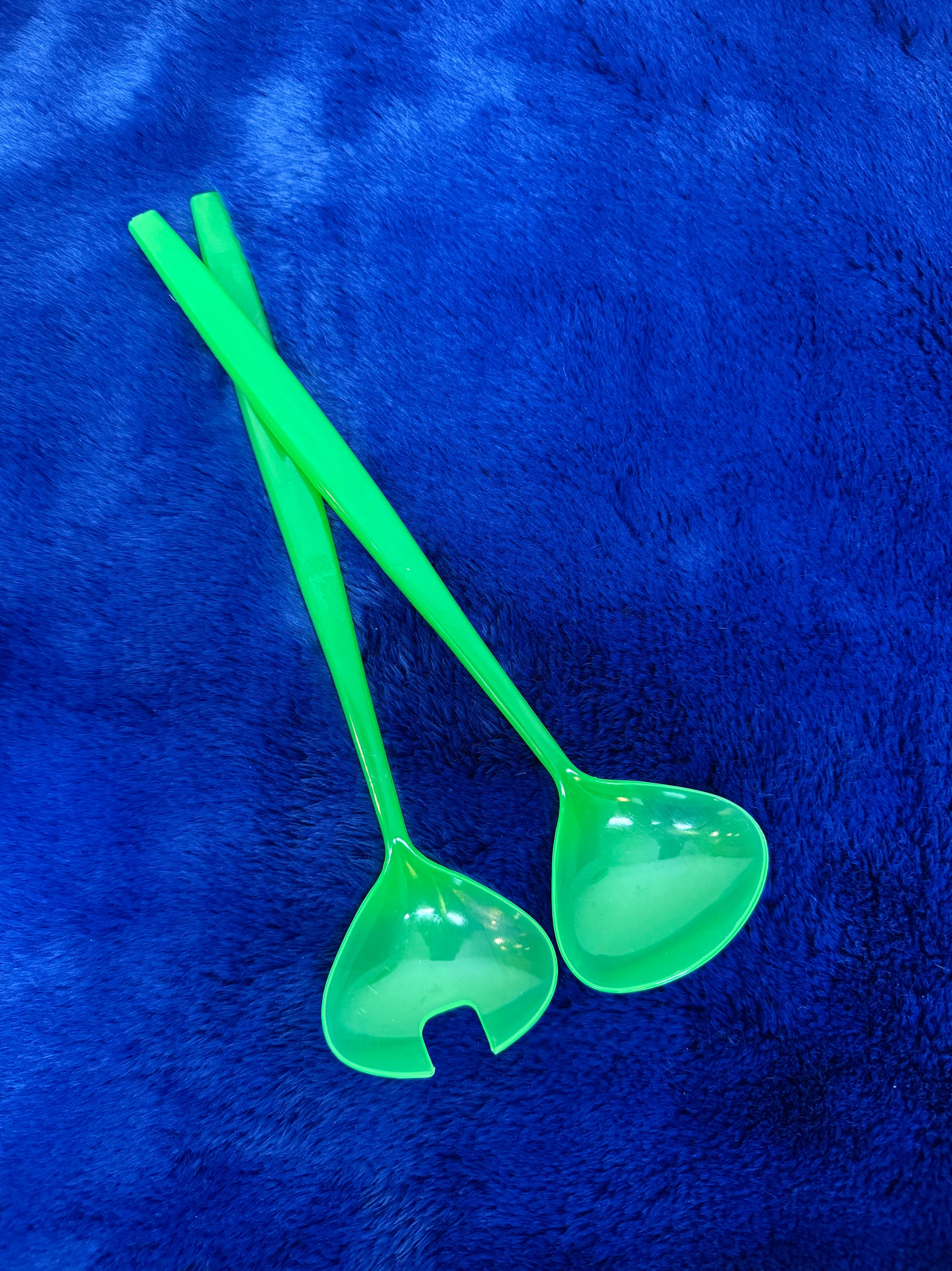 Authentic vintage Decor Australia salad servers in electric neon green lucite/acrylic. Designed during the golden age of Australian mid-century homewares, these sculptural servers are equal parts functional and fabulous. A true statement piece from a brand celebrated for bold, playful design in the 60s–80s.