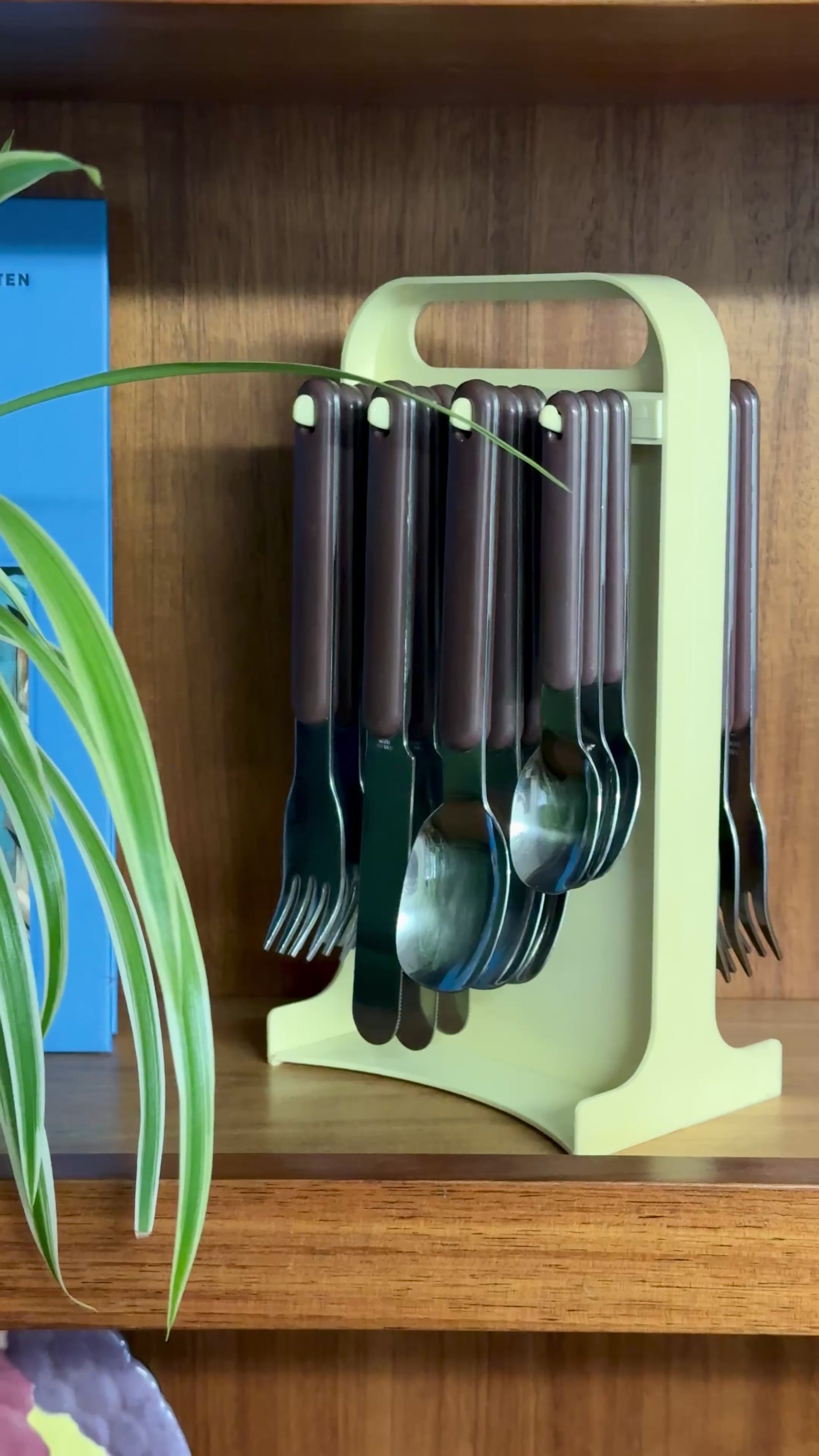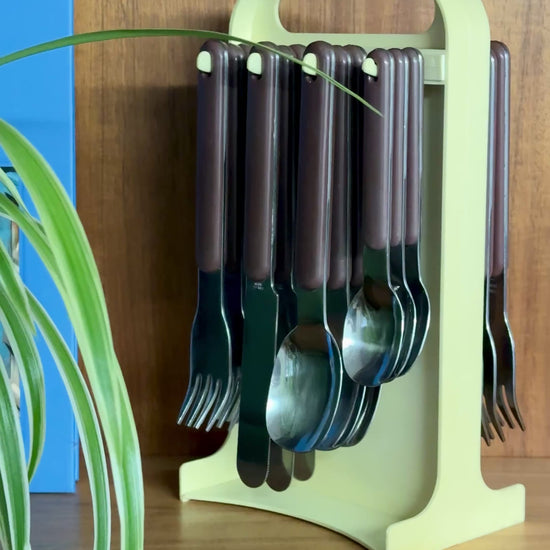 Bring a pop of chocolate brown to your kitchen with this vintage cutlery set, complete with its original plastic caddy. Featuring rich brown plastic handles and stainless steel, this set is the perfect blend of function and nostalgic 70s flair.