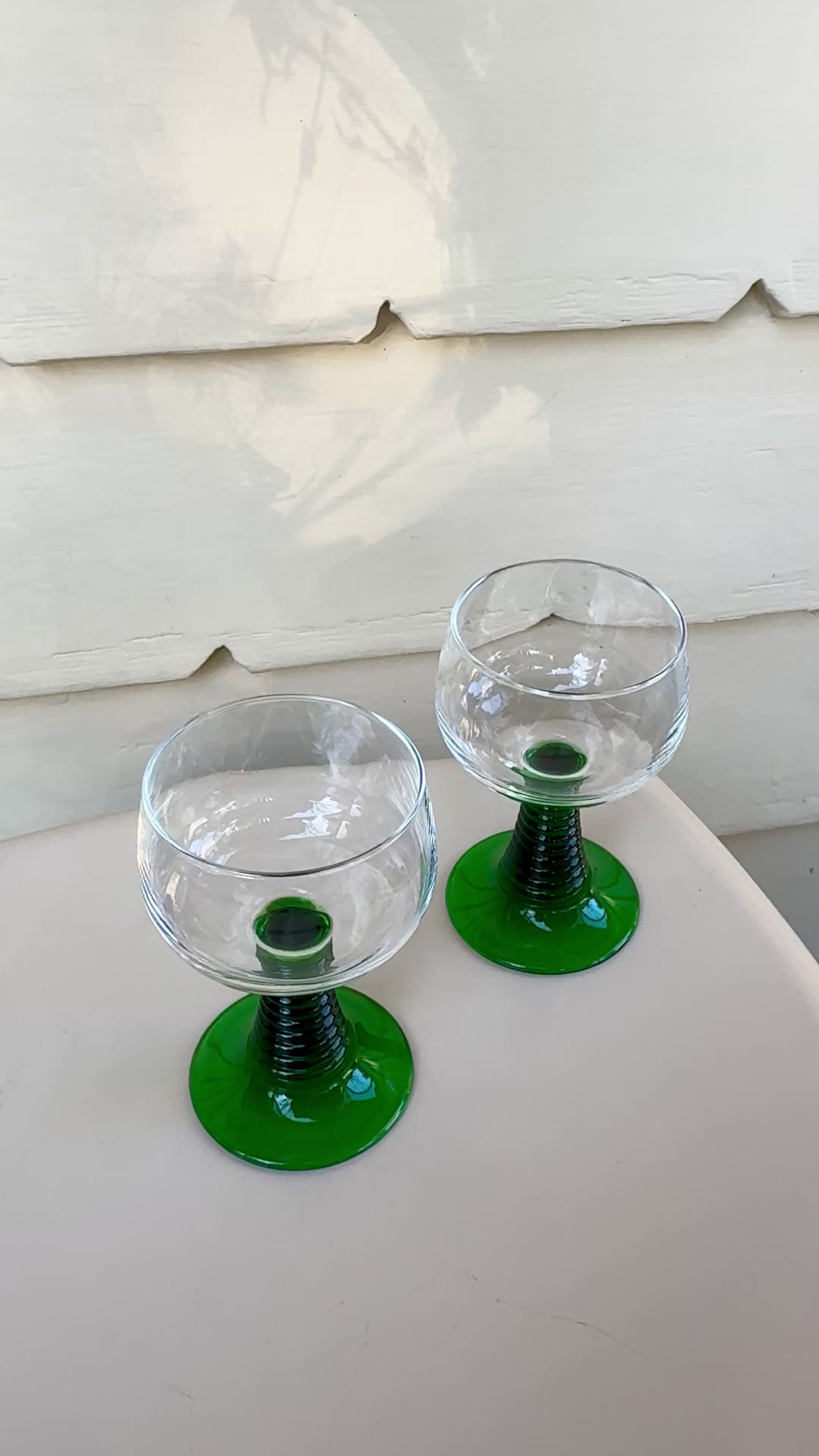 Adorable vintage glasses with emerald green ribbed stems and clear bowls. Perfect for a splash of wine, a nip of something stronger, or just looking sweet on your shelf.