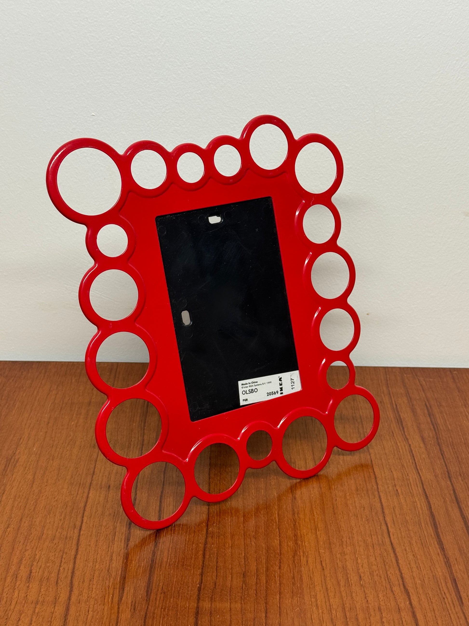 Rare 1999 IKEA OLSBO picture frame in bold red with playful bubble-style cutouts. Made from sturdy plastic, it holds a standard photo (approx. 10x15cm) and can be displayed freestanding or mounted vertically or horizontally thanks to the built-in stand and hanging hardware.