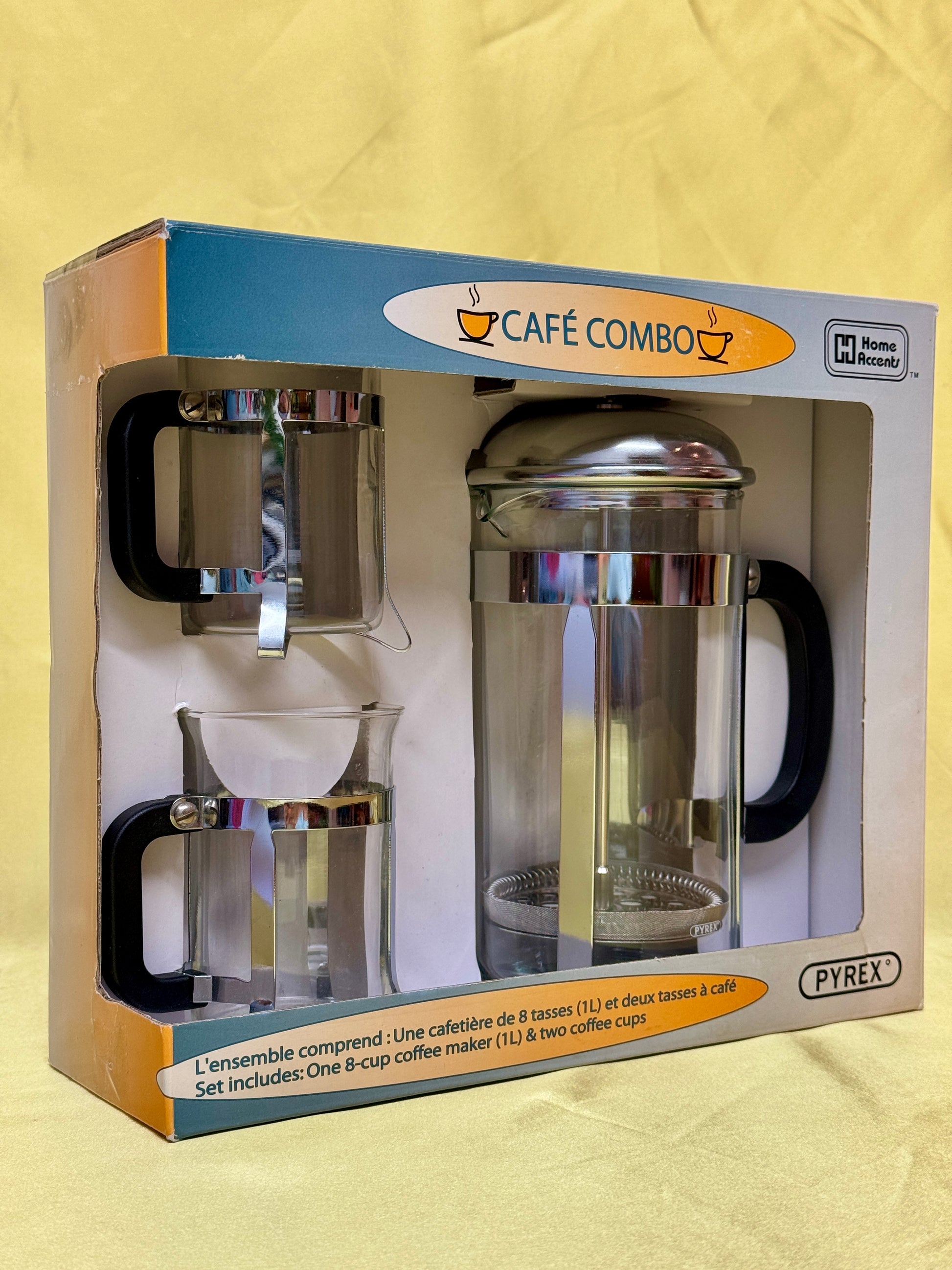 Pyrex Café Combo set - 8-cup (1L) French press coffee maker and two coffee cups