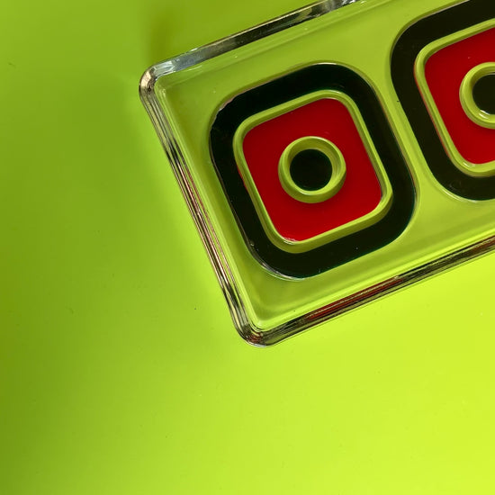 Rare and collectible Walter Kristallglas glass tray featuring an iconic mid-century modern geometric design in vibrant red and navy. Made in West Germany, this striking piece is both functional and artistic — perfect for display or entertaining. A standout item for vintage lovers, retro collectors, or fans of 1960s/70s European glassware.