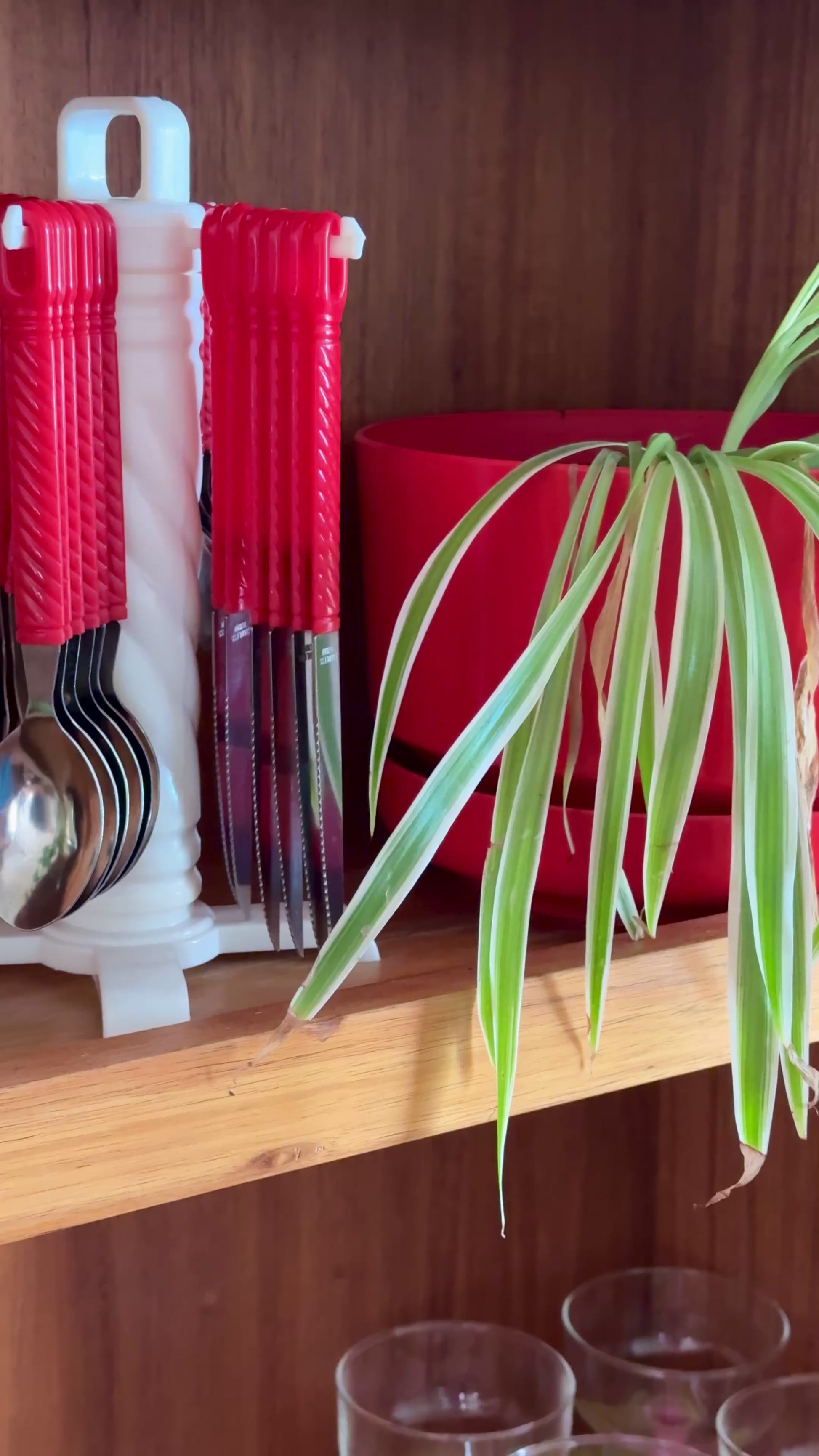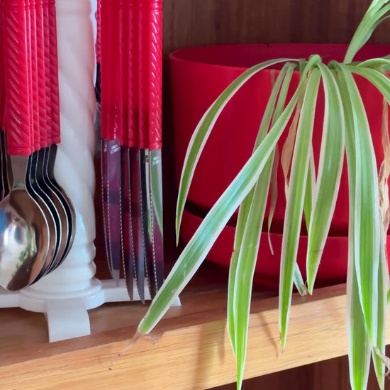 Gorgeous vintage red cutlery set on its original rotating stand. Features the classic twist-handle design and a full matching set of forks, spoons and knives. The red looks amazing displayed on open shelving and adds instant retro warmth to any space. In lovely vintage condition with original box included.