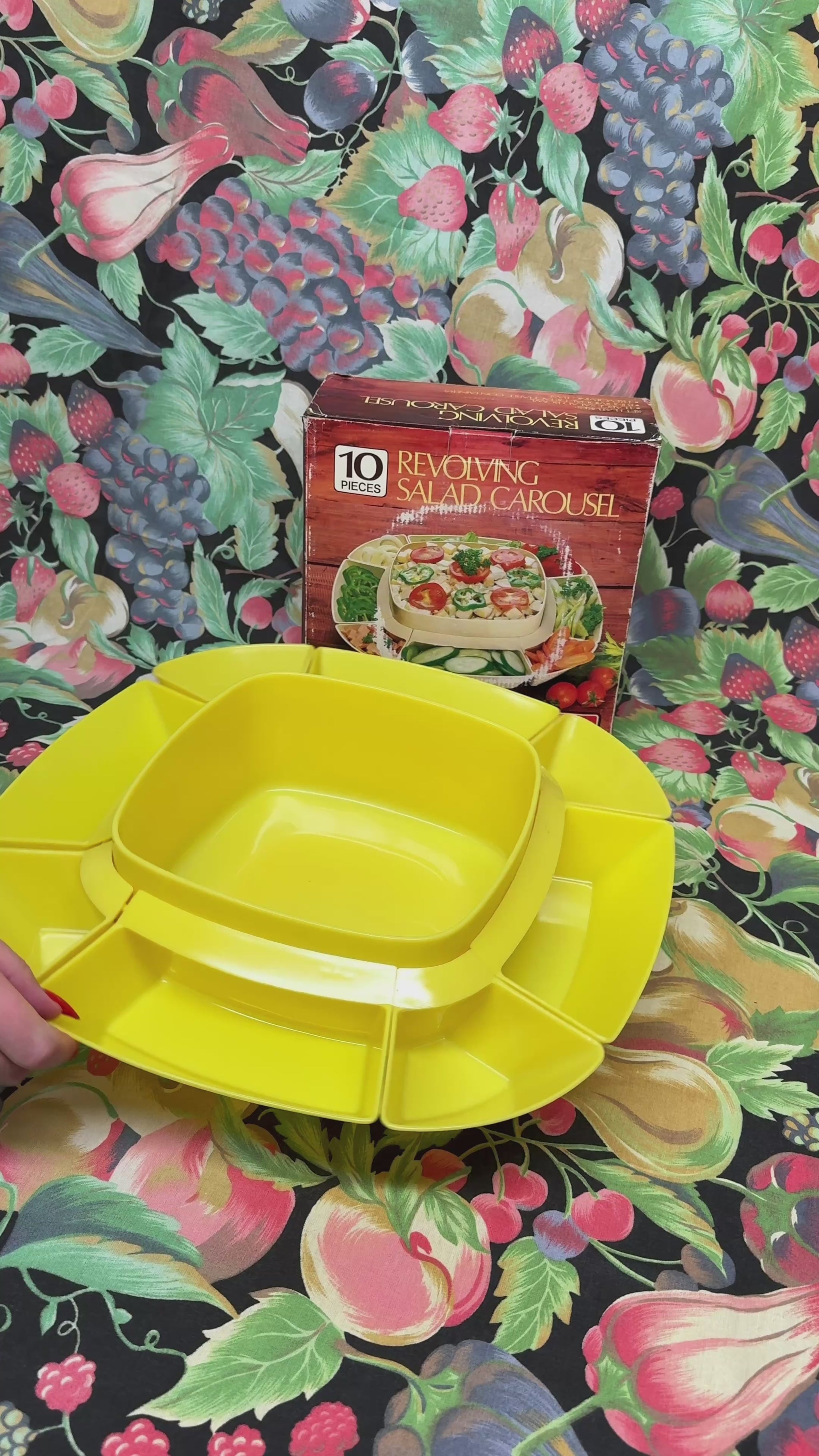 Bright, bold, and ready to serve! This vintage 1970s Revolving Salad Carousel is a fun and functional throwback to retro entertaining. Made in a vibrant yellow with original box included, the 10-piece set includes bowls, serving compartments, and a rotating base — perfect for salads, snacks, or party platters.