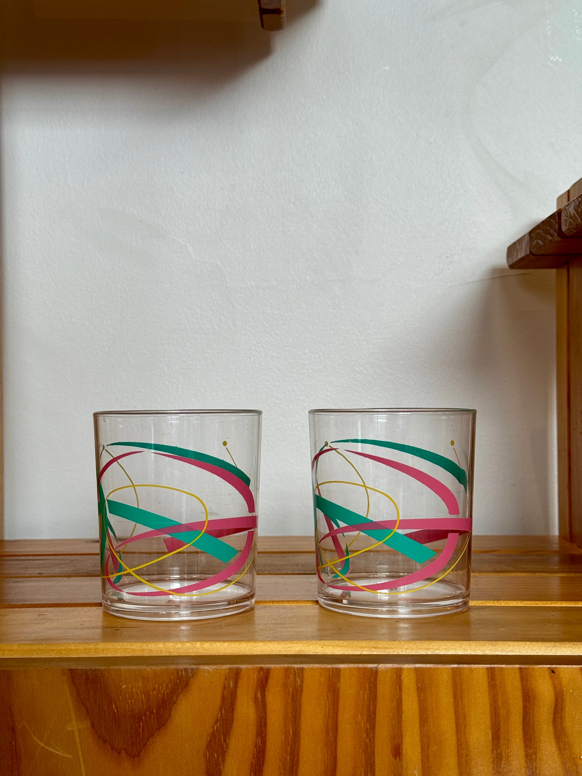 Fun and colourful set of 4 vintage plastic cups featuring a playful swirl pattern in pink, green, and yellow. Lightweight and durable – perfect for picnics, outdoor dining!