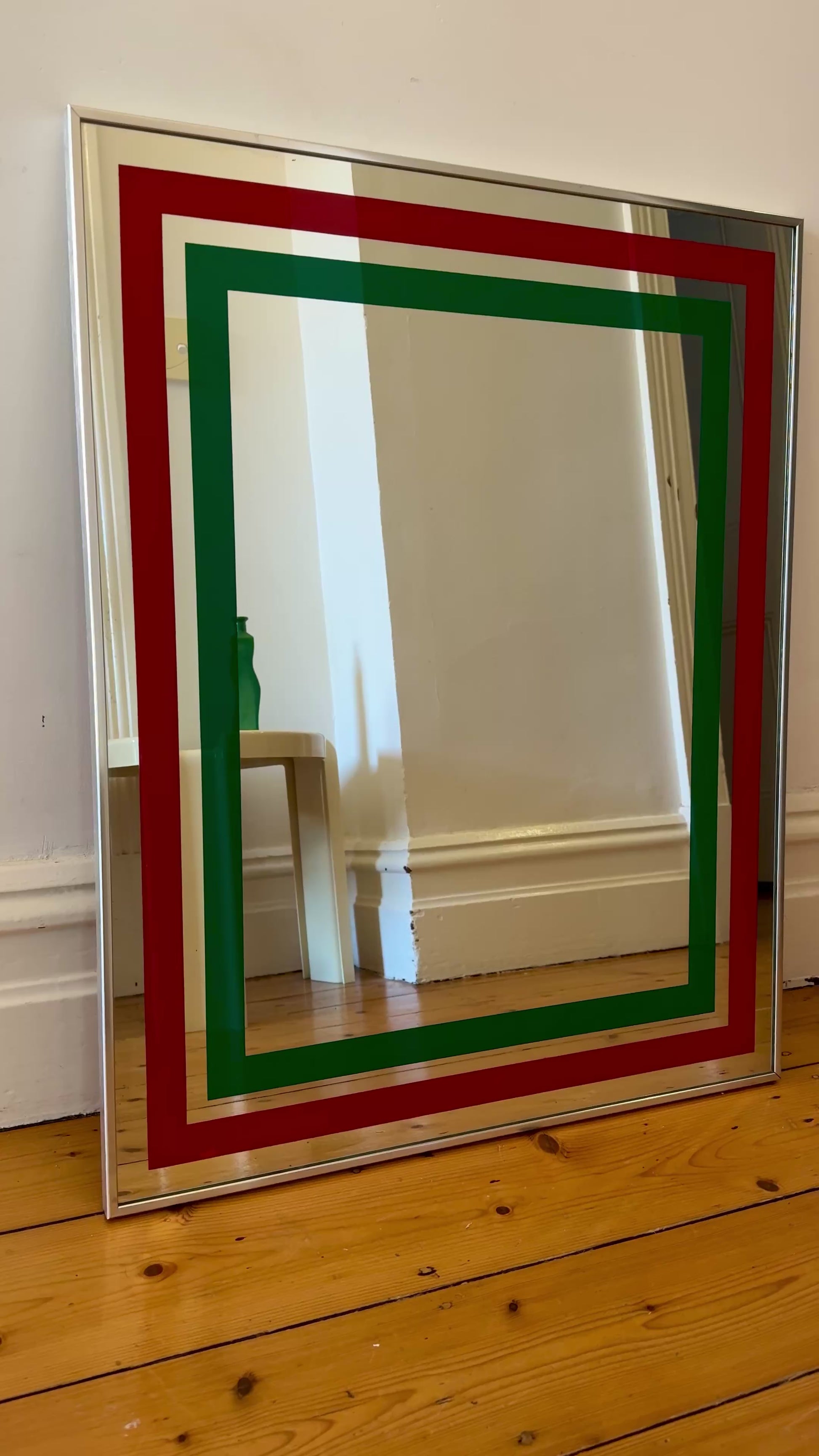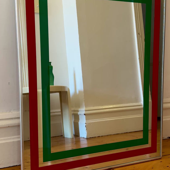 Rare vintage Champion mirror featuring bold red and green geometric bands layered on mirrored glass. With its striking postmodern design and clean silver-tone frame, this piece is a standout example of 1980s Australian decor.