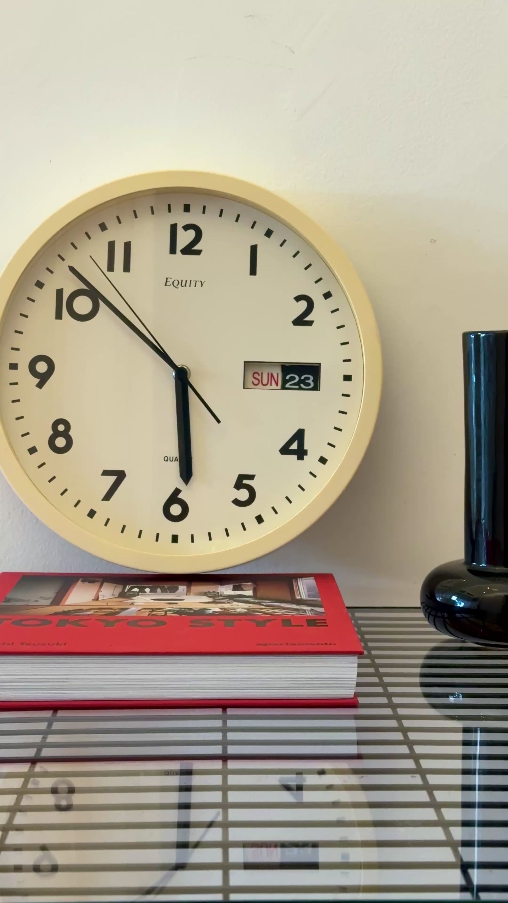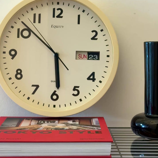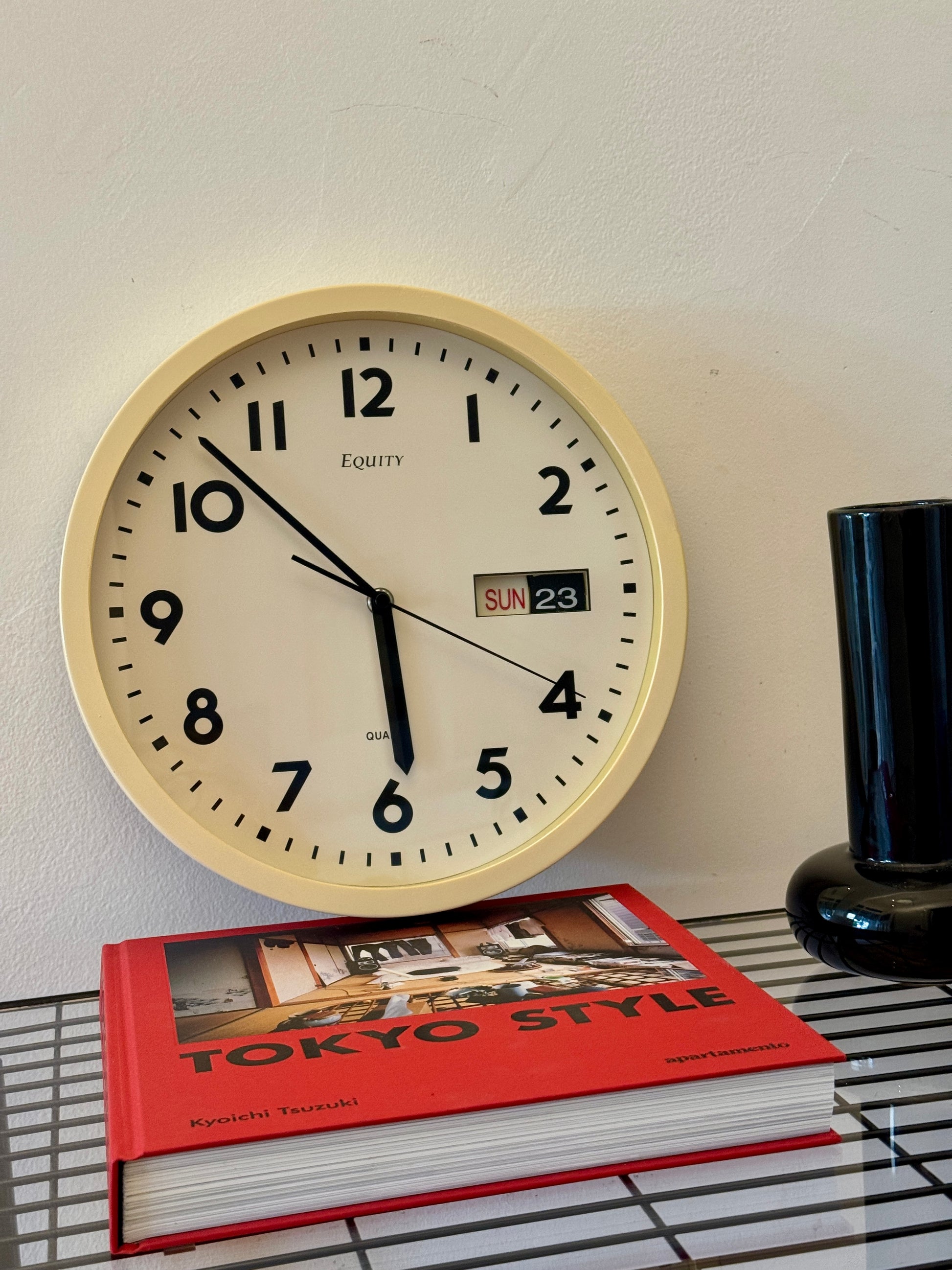 Vintage Equity wall clock in a warm cream tone with bold black numerals and a classic day/date window. Perfect for a design-forward space, studio, or anyone who loves that understated Japanese/Scandi-meets-70s vibe.