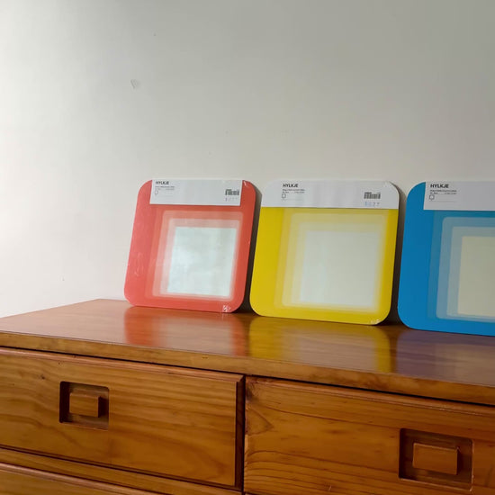 Add a bold splash of colour to your space with these vintage IKEA HYLLEF mirrors ā a rare find from the early 2000s! Each mirror features a vibrant translucent plastic frame and is still sealed in original packaging. Available in yellow, blue, and orange, buy one or collect all three.
