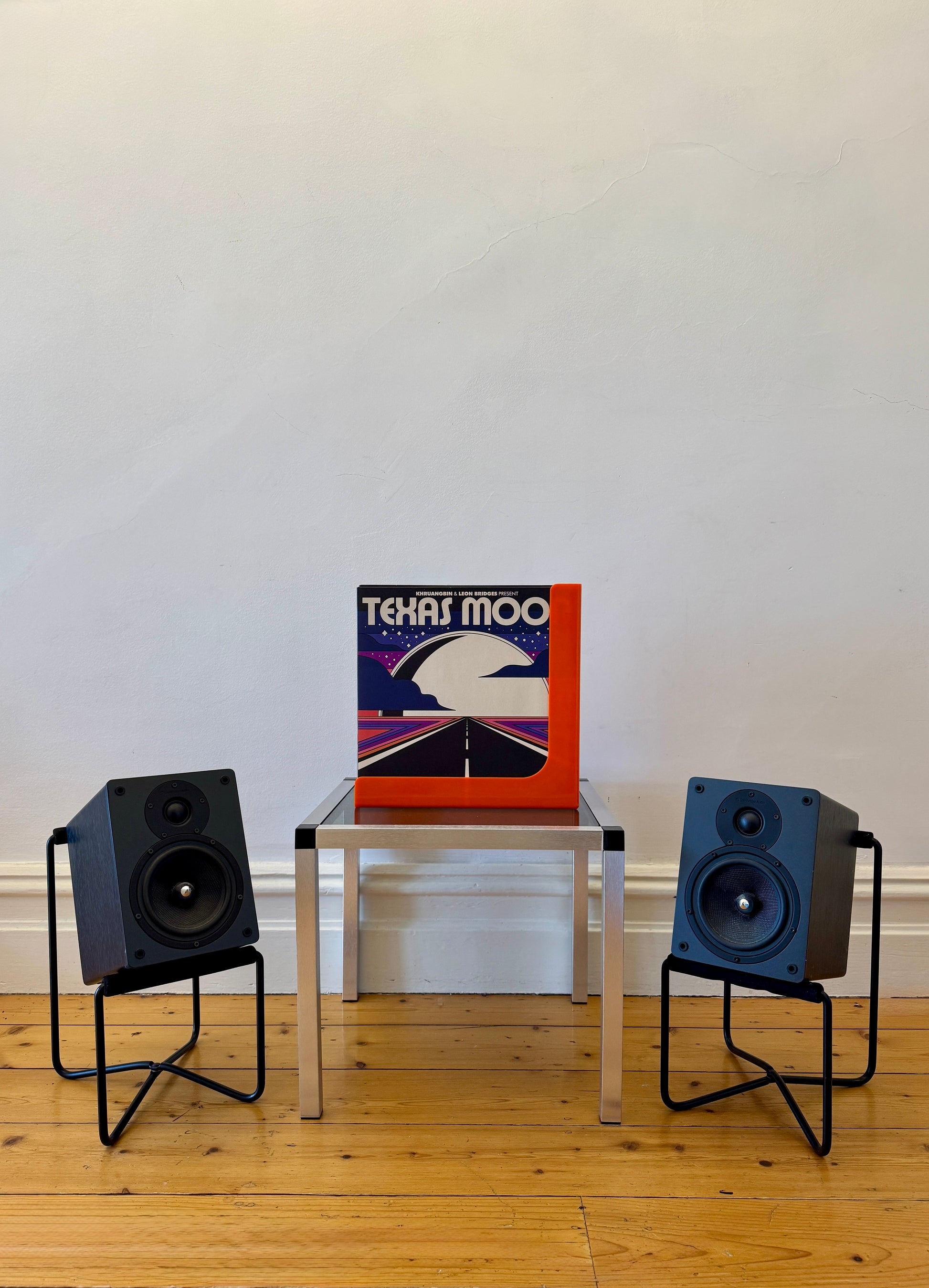 A rare find for design lovers and audiophiles alike. Sleek, minimalist lines with sturdy metal construction, perfect for showcasing your speakers in true Scandinavian style/function.