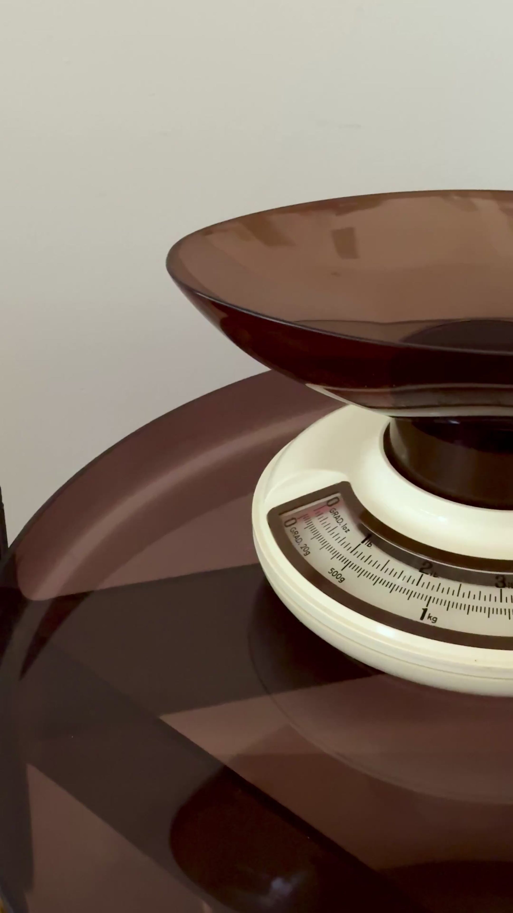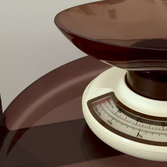 Vintage adjustable kitchen scale, complete with its original smoky brown bowl and box. Made in Hong Kong, it measures up to 2800g / 6lb and features a handy reset function to account for different vessels or added ingredients. A perfect addition for vintage kitchen lovers or collectors.