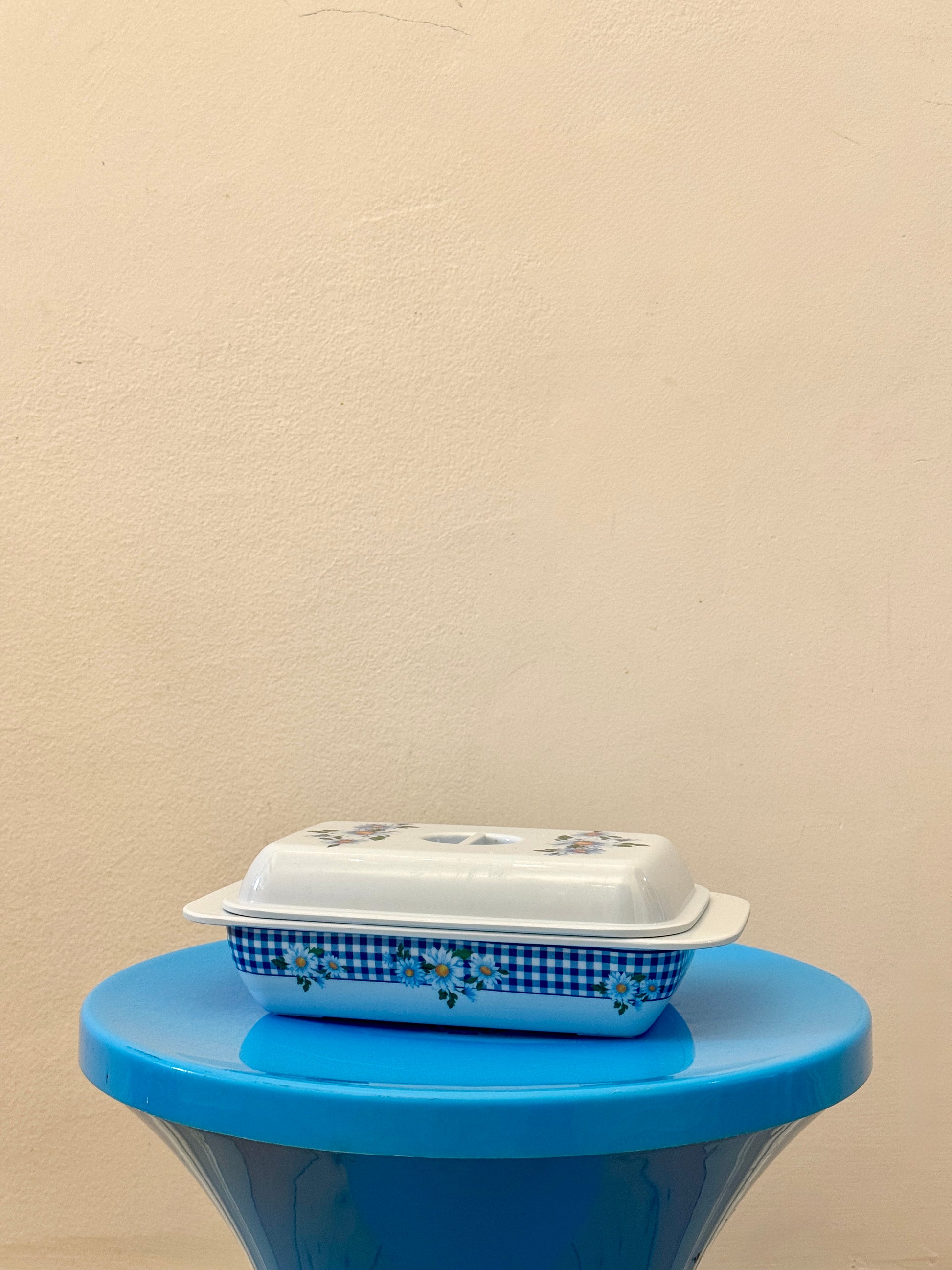 Vintage Melamine Butter Dish – Blue Gingham & Daisy Floral