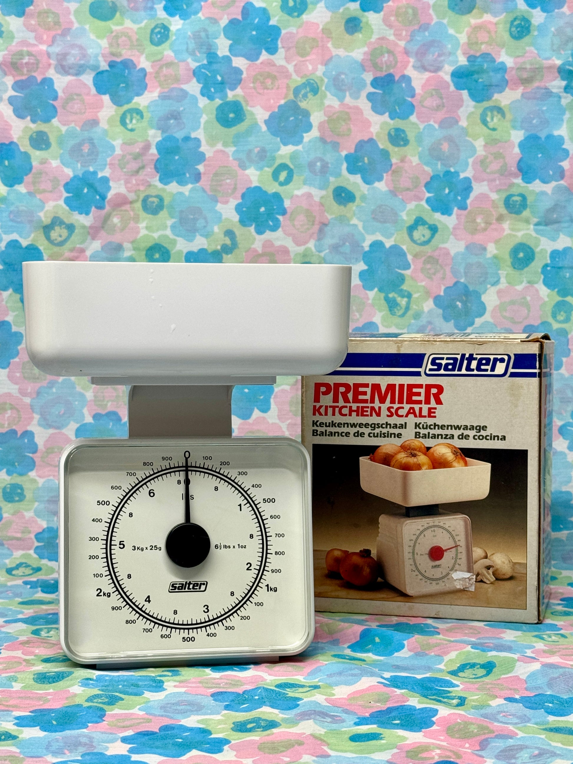 A retro gem for your kitchen! This vintage Salter Premier Kitchen Scale is in excellent condition and comes with its original box. Classic white design with clear dial, perfect for accurate measuring up to 3kg. Great for baking, display, or adding a nostalgic touch to your kitchen decor.