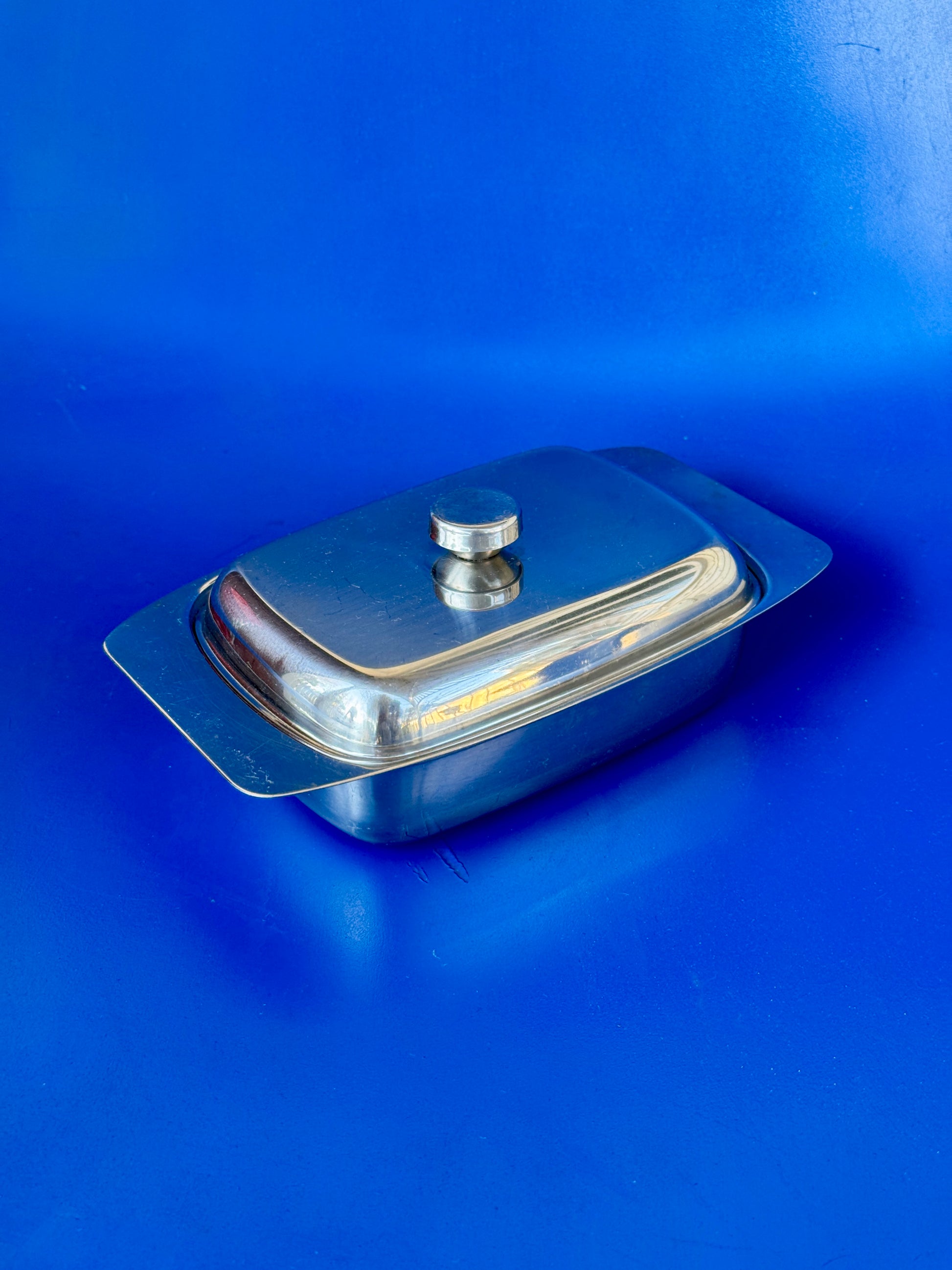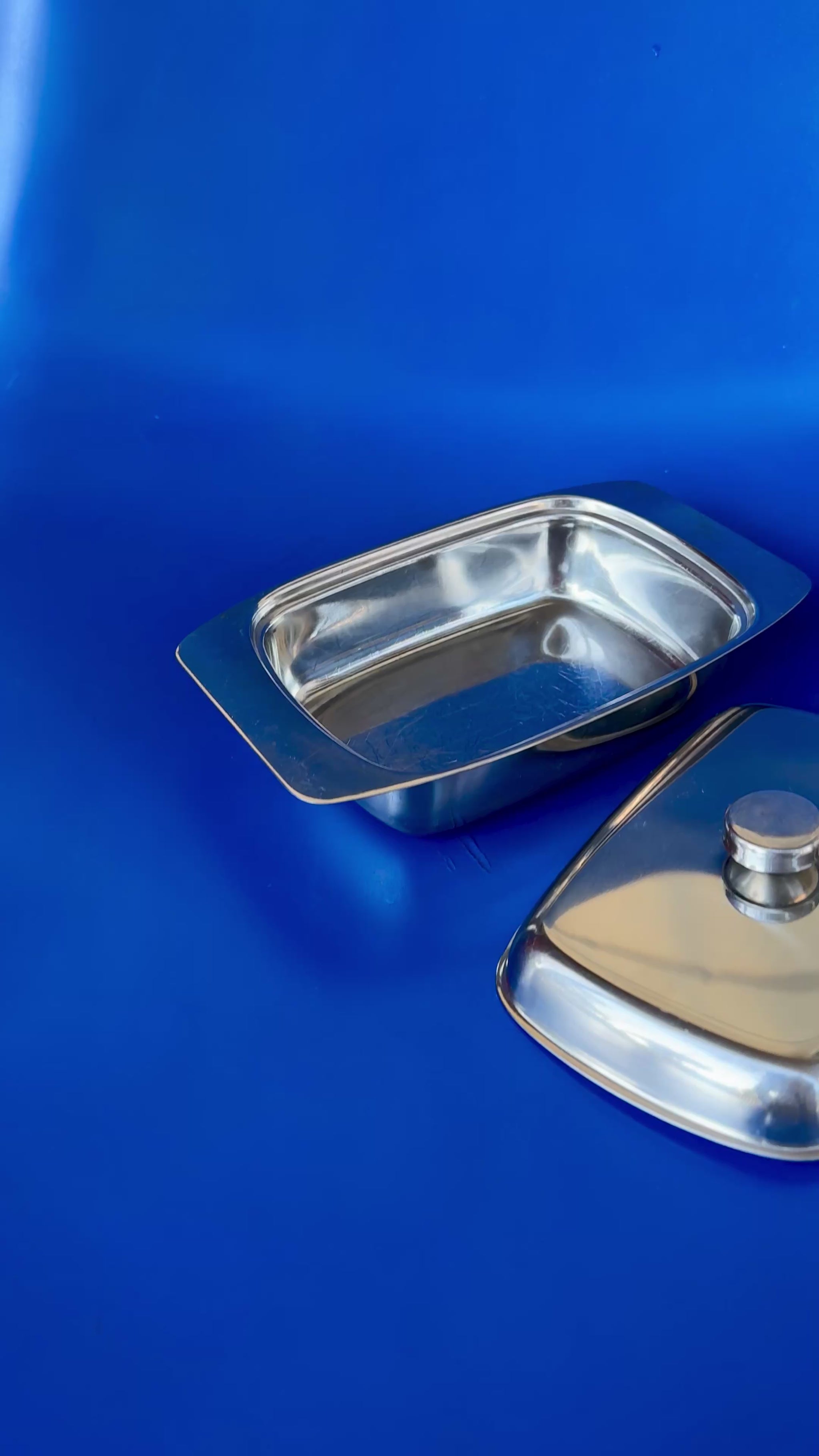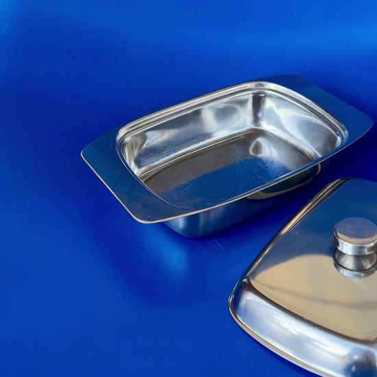 Sleek vintage stainless steel butter dish with matching lid. Durable, functional, and effortlessly elegant.