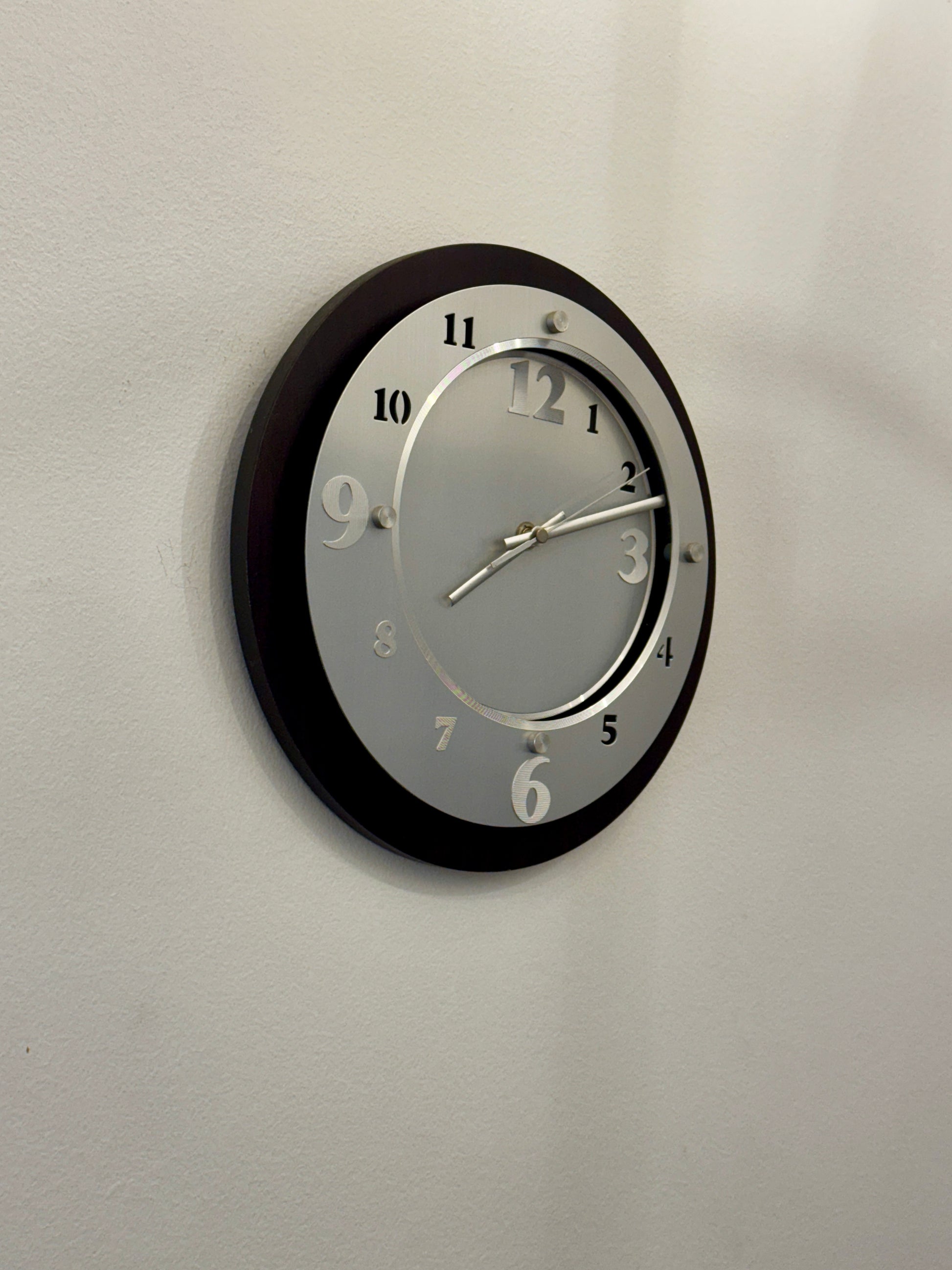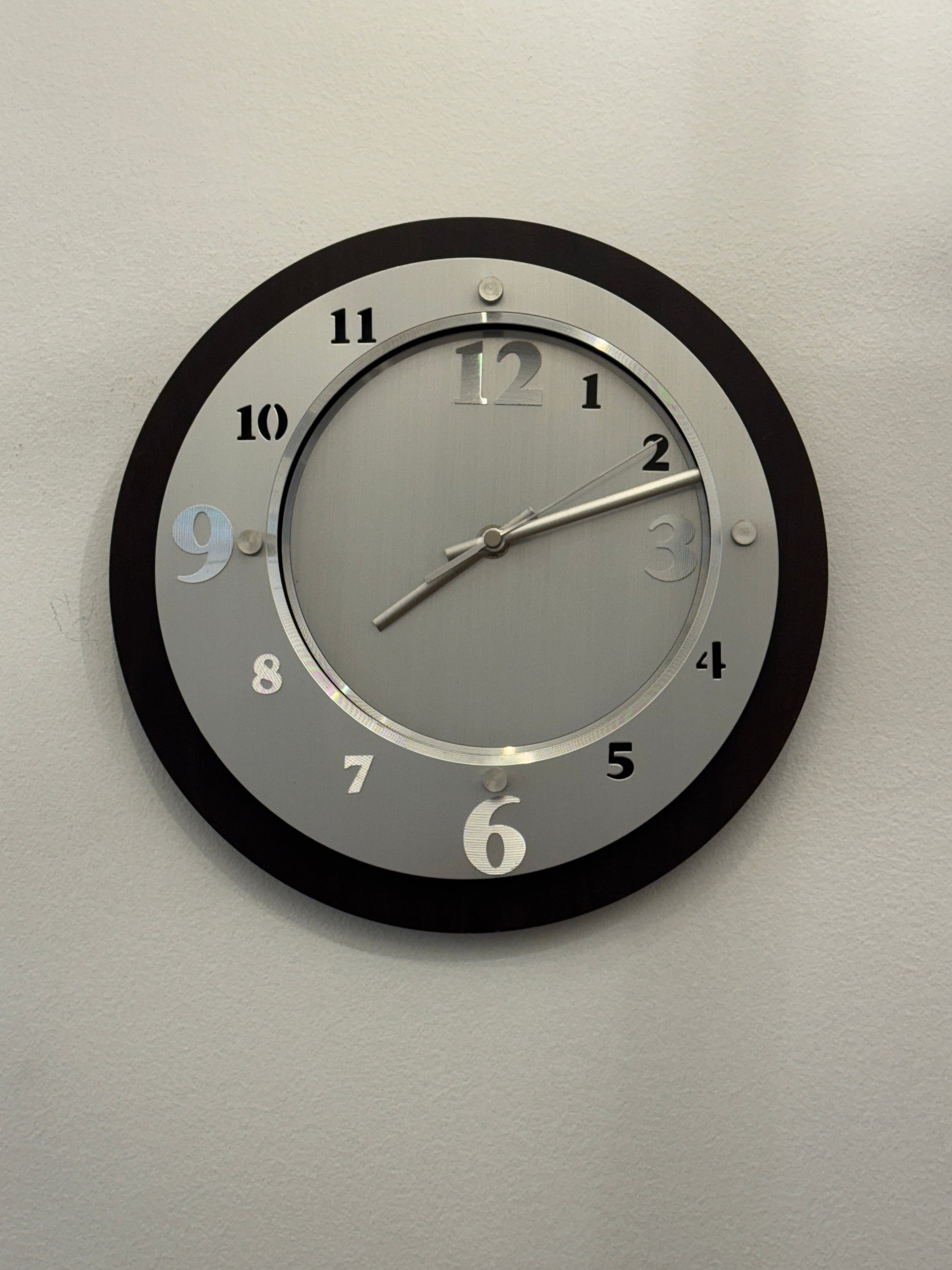 • Design: Brushed silver-tone frame with wooden background and bold white numerals